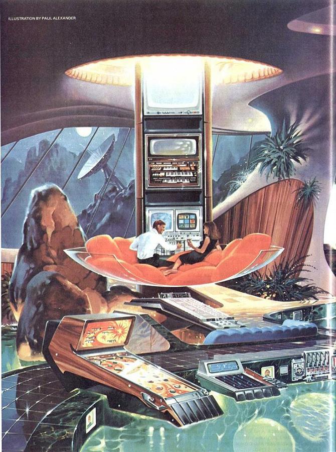 What am I looking at, here? Are those swim up pinball machines? Is that a giant hovering martini glass office/sex pit?