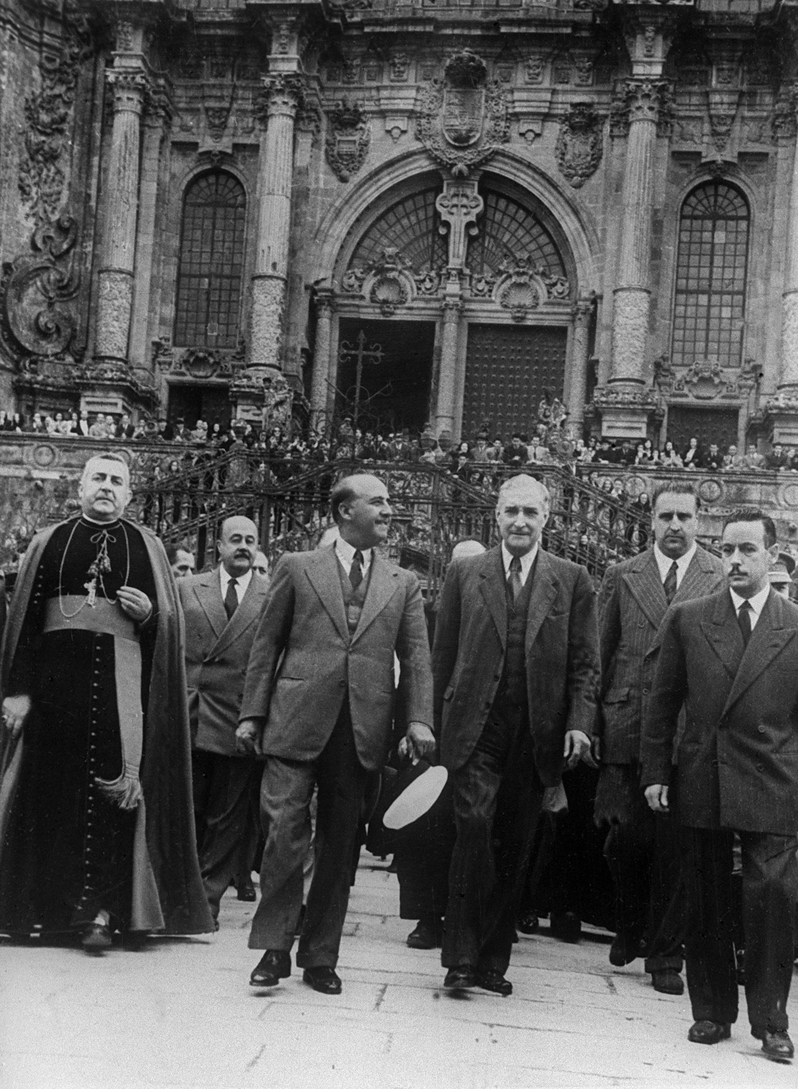 The dictators of Iberia, Francisco Franco of Spain and Antonio de Oliveira Salazar of Portugal flanked by security guards as they exit the Santiago de Compostela Cathedral, 1950. Unlike their right wing counterparts throughout Europe both men made sure to remain neutral during WWII (3543×2595)