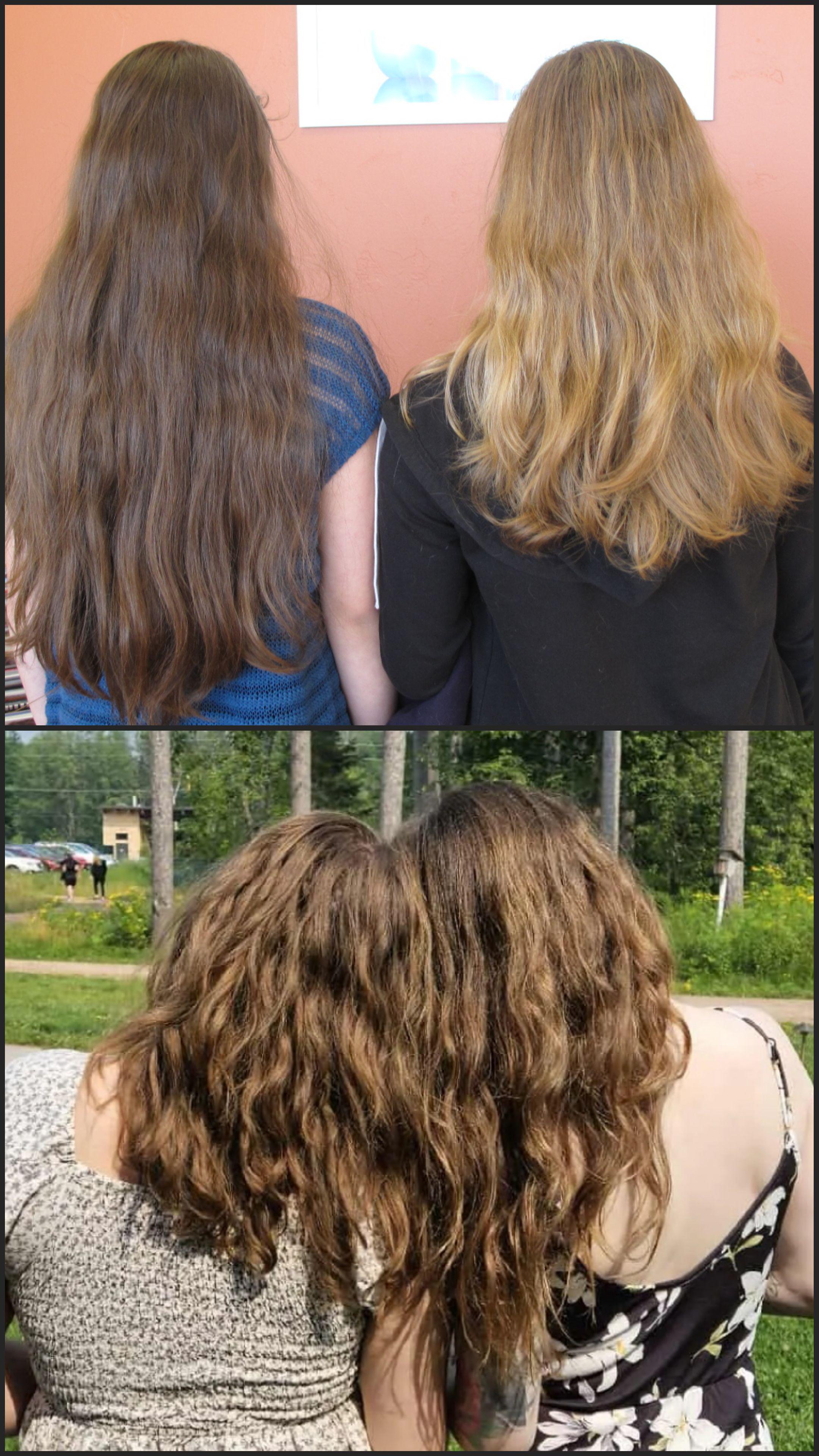 You see how the top of the head is darker on the girl on the right hand side? I think it’s some bleaching. I think it’s coming out of the scalp the same color as the one on the left, but the amount of time spent outside is lightening the hair.