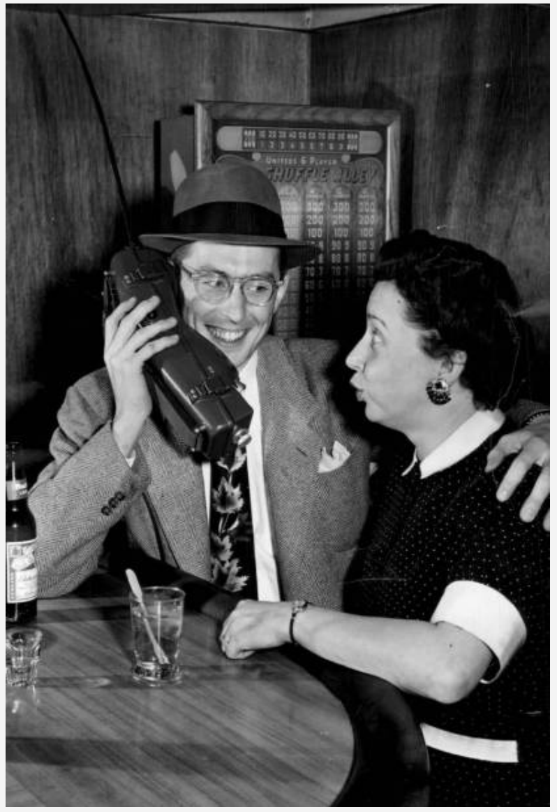 My father was a reporter who somehow got hold of a military-grade phone and for some reason decided to take it to a bar and make a call from there. The woman was a waitress. I'm not sure if he's calling my mom.