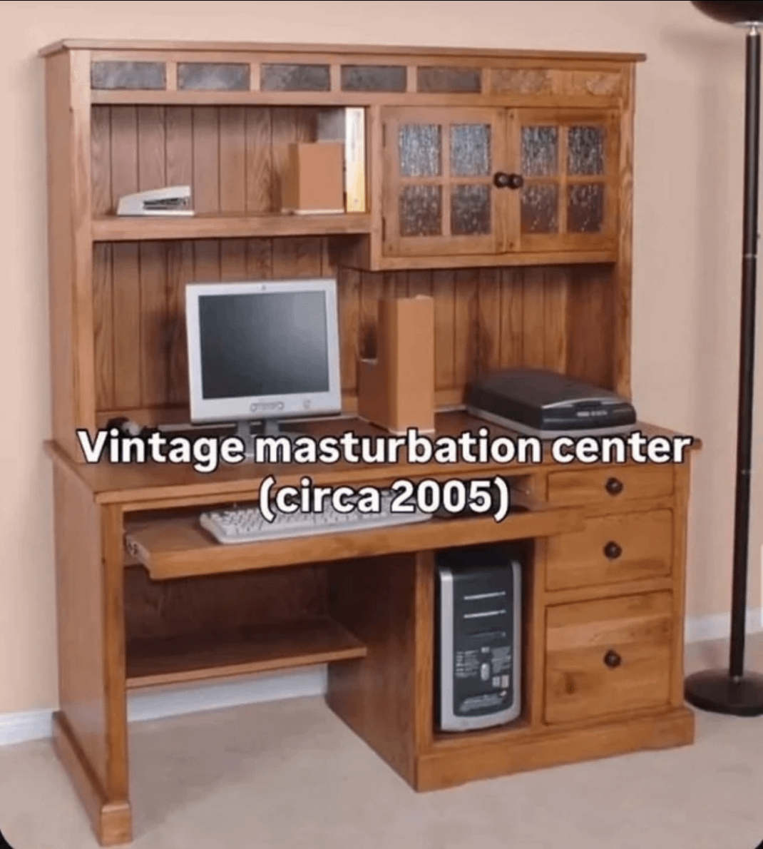 GroundPepper on April 10, 2026 5:27 pm Needs to be a CRT monitor with the MDF table top caving in under the strain. Also needs an AOL CD somewhere on the desk.