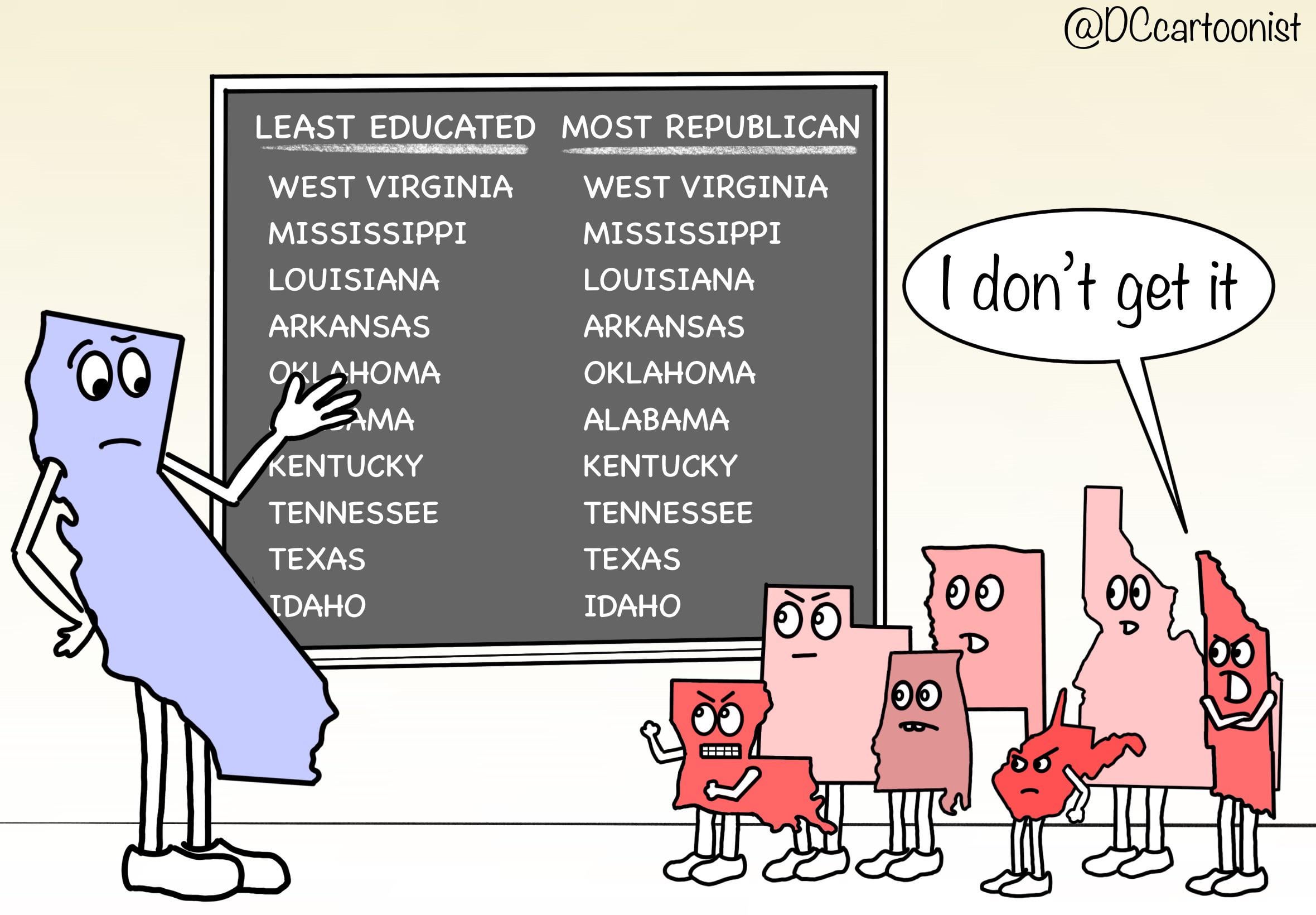 Maybe give Massachusetts, Vermont, Maryland, Connecticut, Colorado, New Jersey, Virginia, New Hampshire, Minnesota, or Washington a shot at running the presentation: https://worldpopulationreview.com/state-rankings/least-educated-states