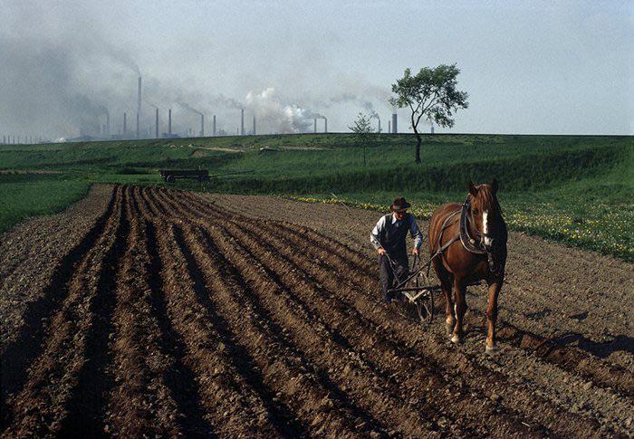 Polish man using a horse-drawn plow to tend to his field, as smoke rises from industrial factories in the distance, Poland, c. 1981. – photo taken by French-Swiss photographer Bruno Barbey. [700 x 485]