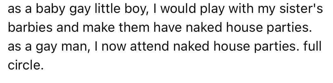 Does gay equal naked parties? I don’t think I’d like to go to any naked parties gay or straight…