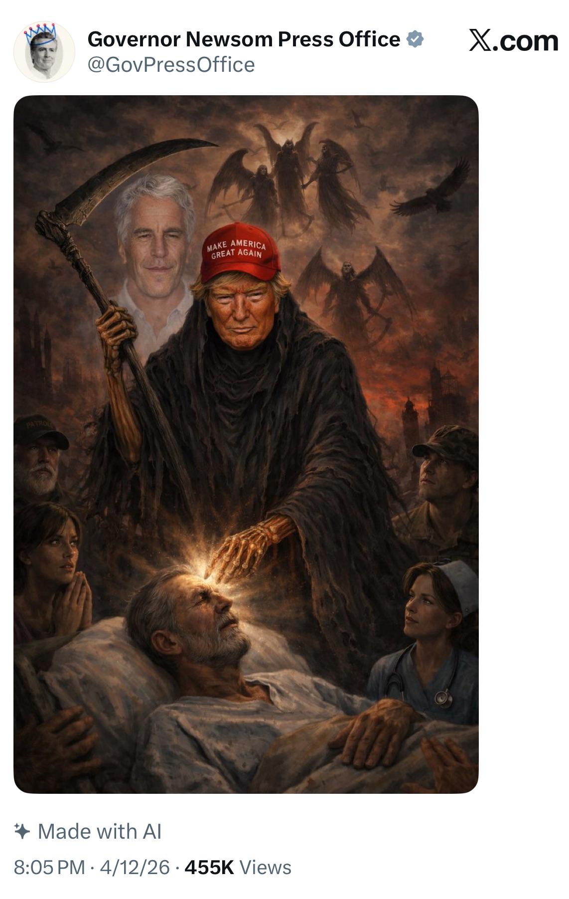 NickCostanza on April 13, 2026 2:46 pm https://preview.redd.it/5dbo2uz30zug1.jpeg?width=977&format=pjpg&auto=webp&s=018c47b193a0d1ff8796848753f8fb4835a8a3c1 A reference to Trump posting this fwiw. Yes, he added a demon in the background for some reason. Yes, he seems to think he is Jesus for some reason. Yes, it looks like he is healing Epstein for some reason.
