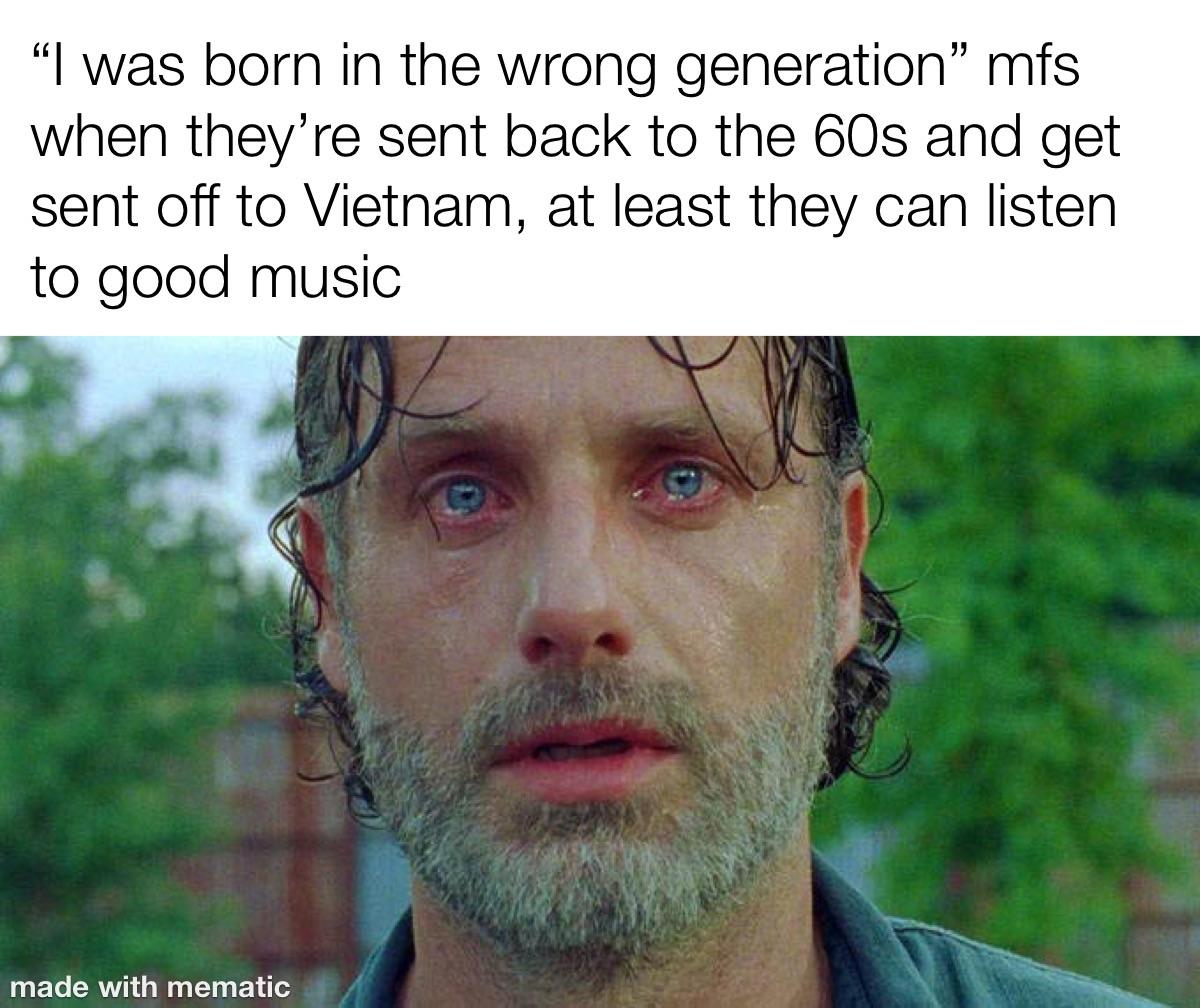 Everytime i read someone typing “i was born in the wrong generation” i imagine some mofo thinking it will be ok in the 60’s but, by some time travel bull, will keep the benefits of the current era, like being in a concert of The Beach Boys and be able to post it on TikTok or have their human rights respected.