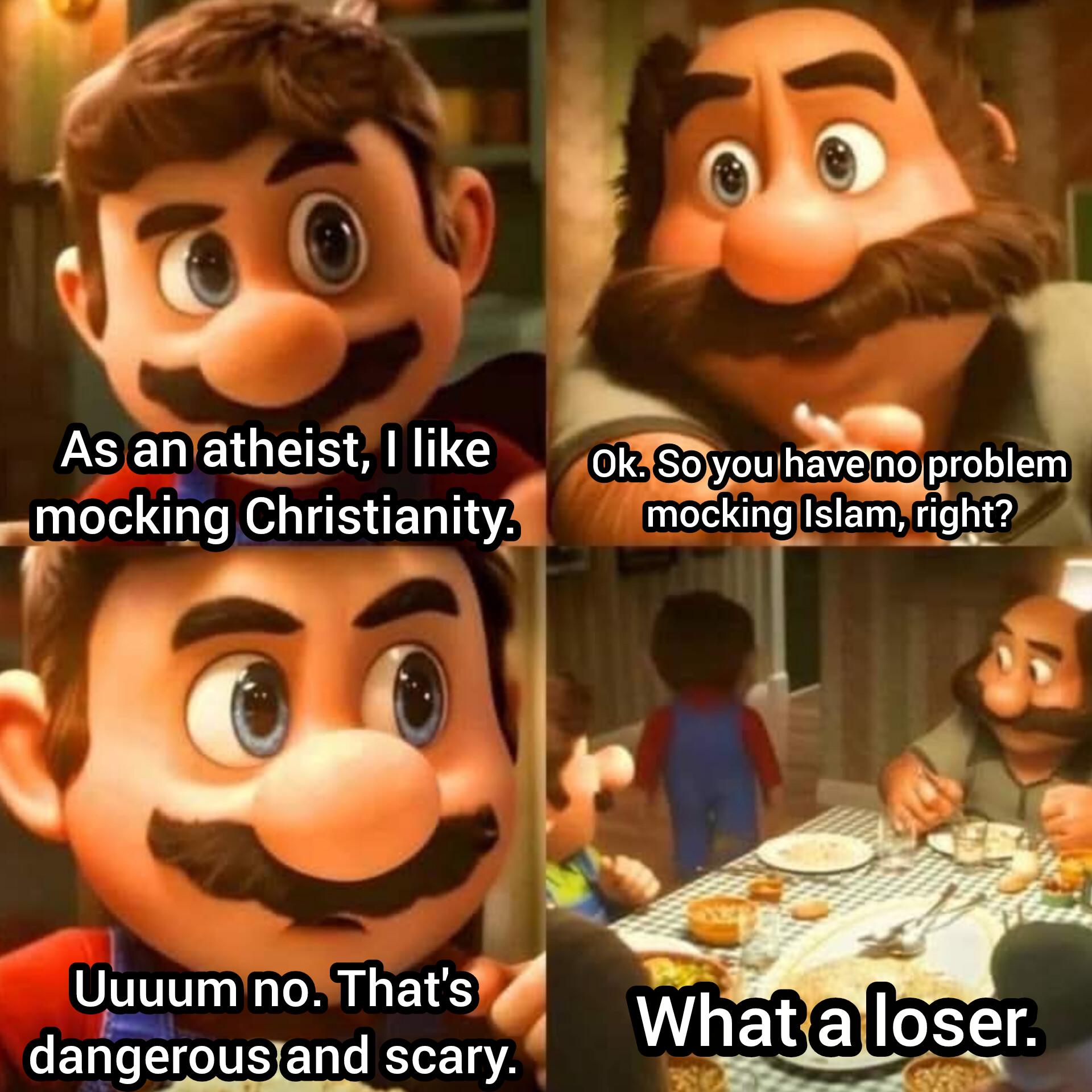 I’m an atheist, I don’t really care about mocking Christianity, other than the basic “obviously there’s no big sky daddy” and the extremist christians that are way into it, I have absolutely no problem mocking Islam however, I am now brave to you according to your post’s title