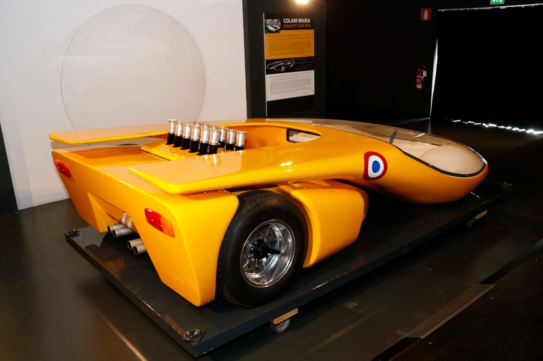 Colani Miura ‘ Le Mans concept ‘ . Luigi Colani . 1970 . Built using the rear chassis section of a Lamborghini Miura plus a separate glider-like cockpit . Notice the joystick . This car is an exemplar of his ‘biodynamic’ design philosophy .