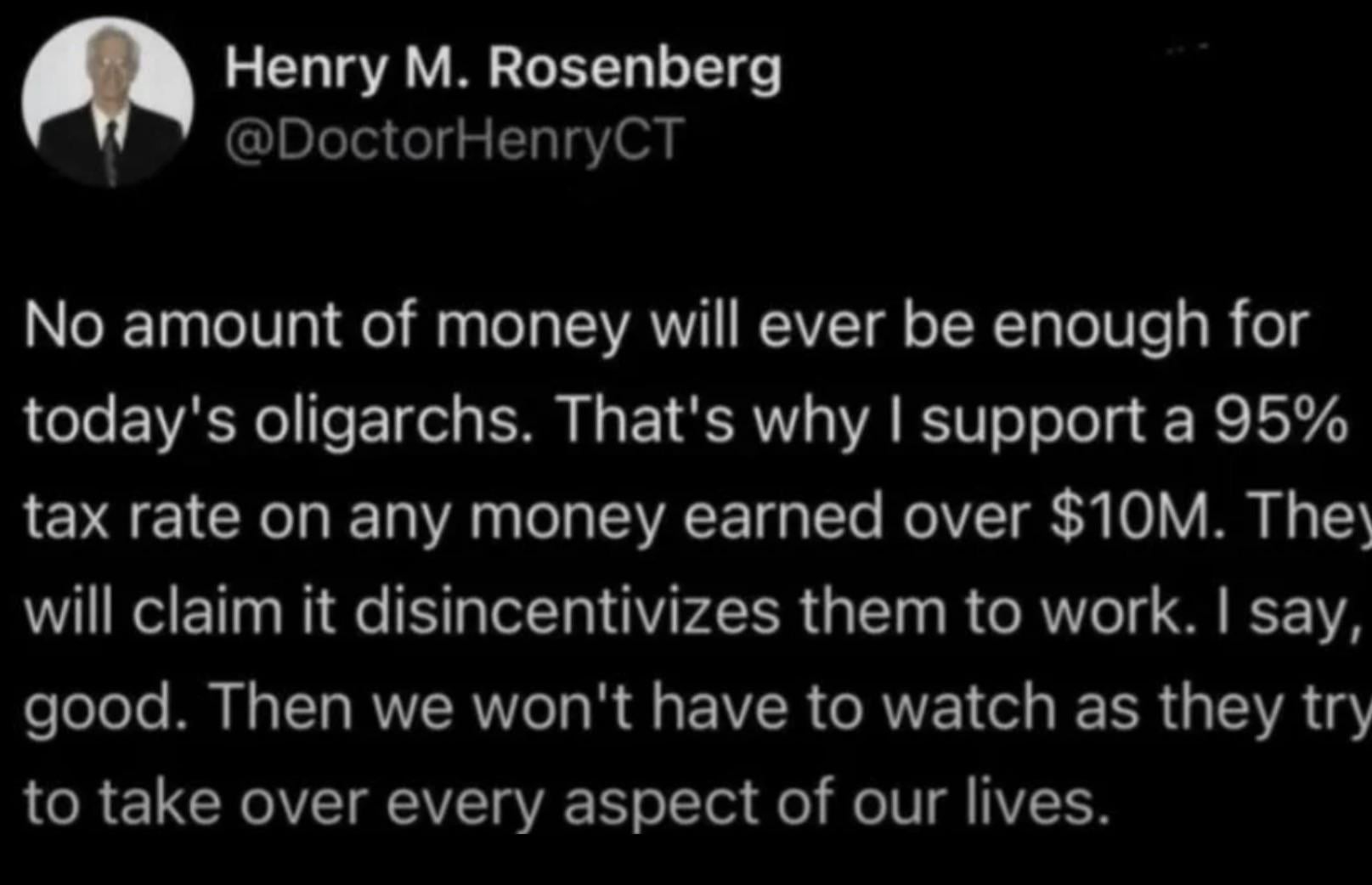 10m isnt enough, 600m maybe to much but go ahead and tax billionaires, they will literally take their money and their jobs to somewhere people are hungrier, more desperate and dont care.