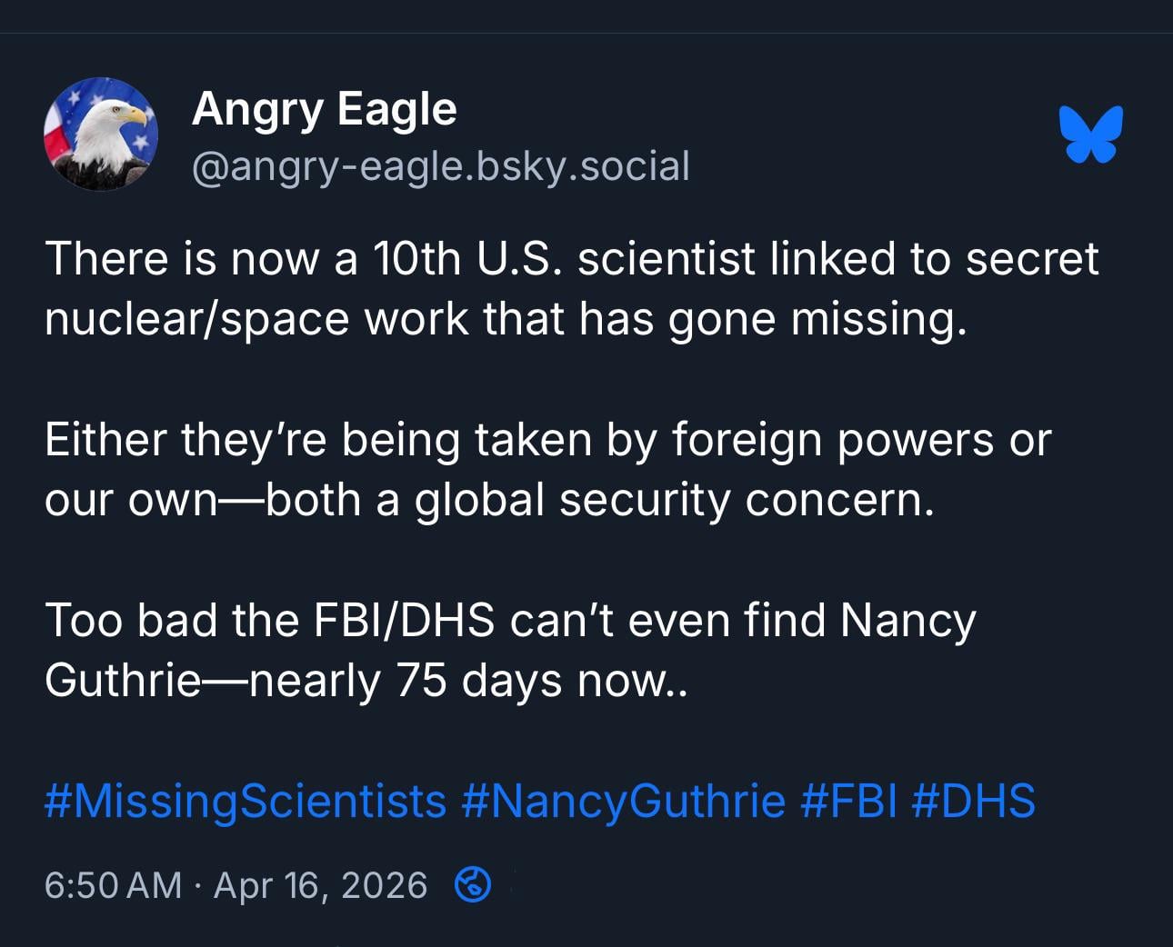Context for story — There are 8 individuals connected to various scientific or defense fields who have died or gone missing since 2023. Calling them all “missing nuclear/space scientists” is not accurate.