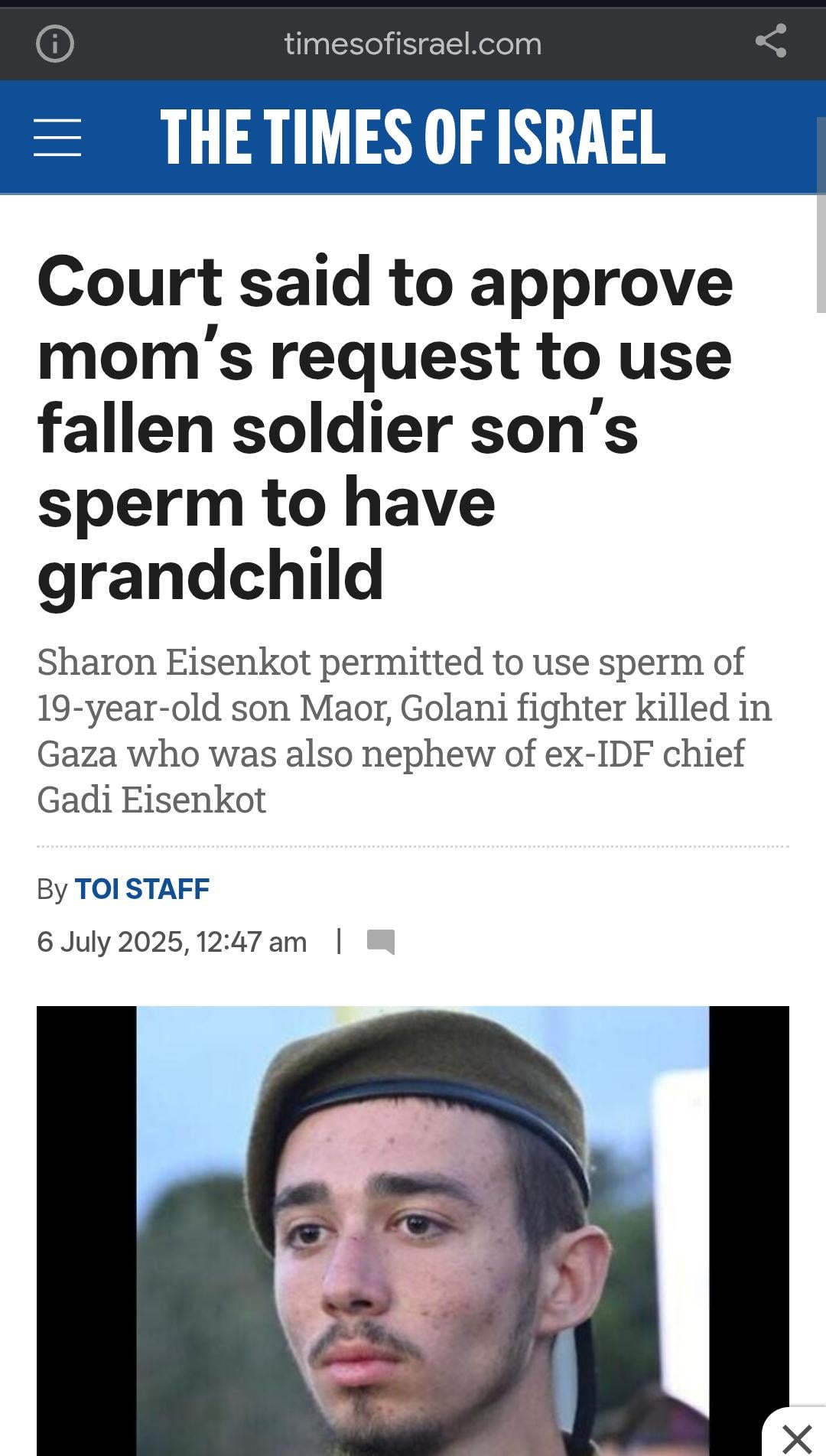 >An Eilat court has authorized Sharon Eisenkot to use sperm retrieved from her son, IDF soldier Maor Eisenkot, who was killed in Gaza in 2023, to have a grandchild through surrogacy, according to a Channel 12 report Saturday.