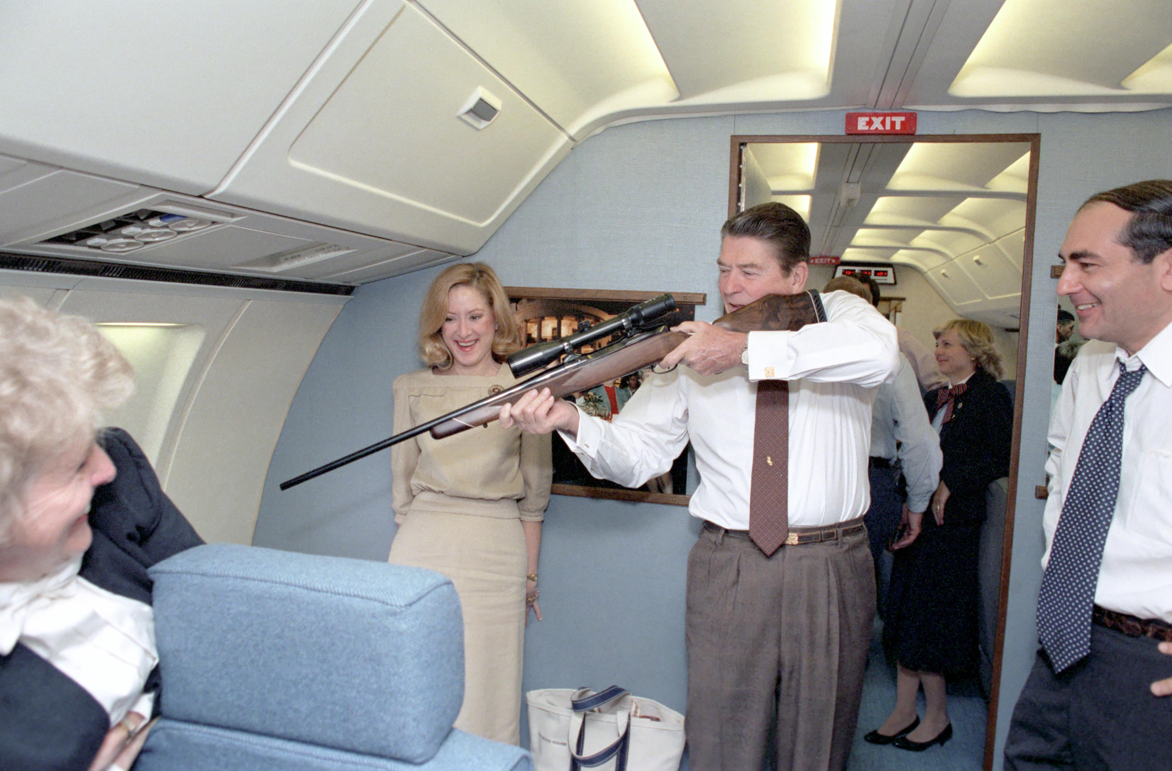 American President Ronald Reagan aiming a rifle aboard Air Force One, 23 November 1983. [4000 × 2632]