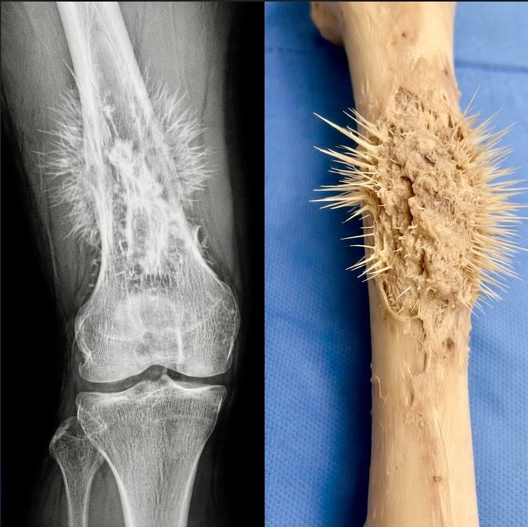 I lost a lovely old greyhound girl to this cancer it came on fast. It is common in greyhounds apparently. But wow – what a terrible thing when the body does this to us. I don’tknow how they flensed this bone to show the cancer whether the person died or lost their leg becaus eof it, but yes this is really interesting but also once seen not unseen and I hope I never have to contend with it again irl now I have seen it. (Our darling old girl a week before diagnoses and euth.)