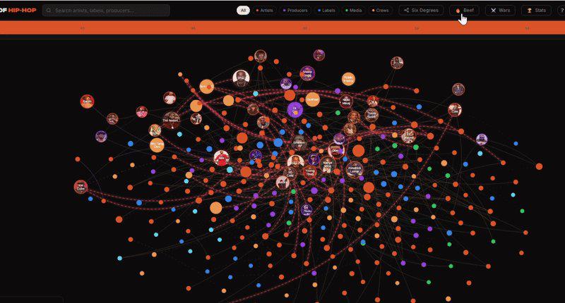 Tools: interactive map with path finder, beef-only mode, solar system view per artist, era timeline.