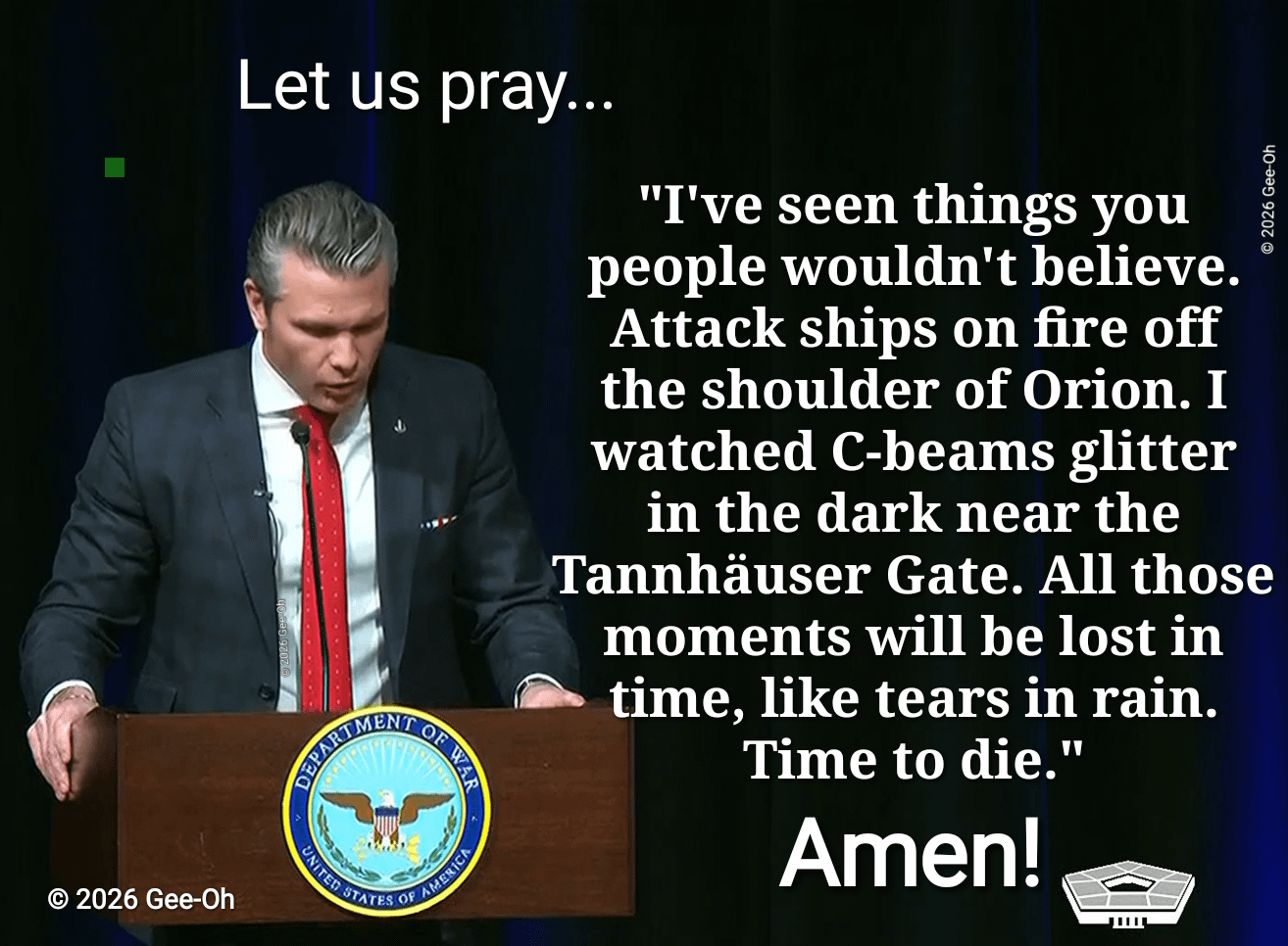 “But you know, touchin’ his wife’s feet, and stickin’ your tongue in her Holiest of Holies, ain’t the same fuckin’ ballpark, it ain’t the same league, it ain’t even the same fuckin’ sport.” – Petey Hegseth, 4/18/25, talking about the first lady and her bolted on personalities.