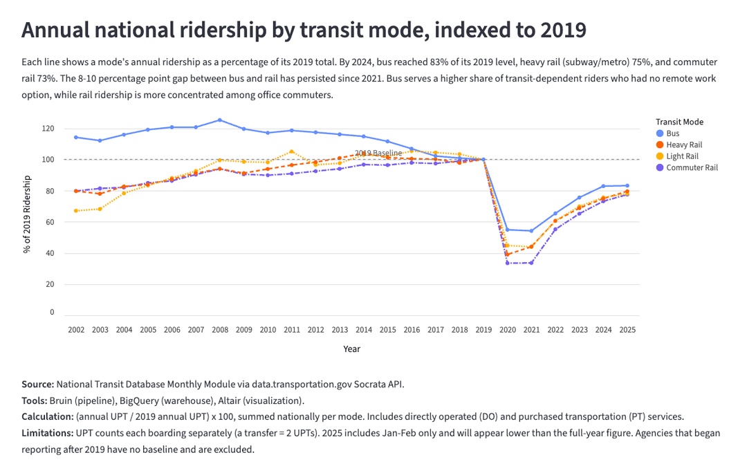 **Source:** National Transit Database (NTD) Monthly Module via data.transportation[.]gov Socrata API (dataset `8bui-9xvu`). US Census Bureau American Community Survey (ACS) 1-Year Estimates, Table B08301 (2023).