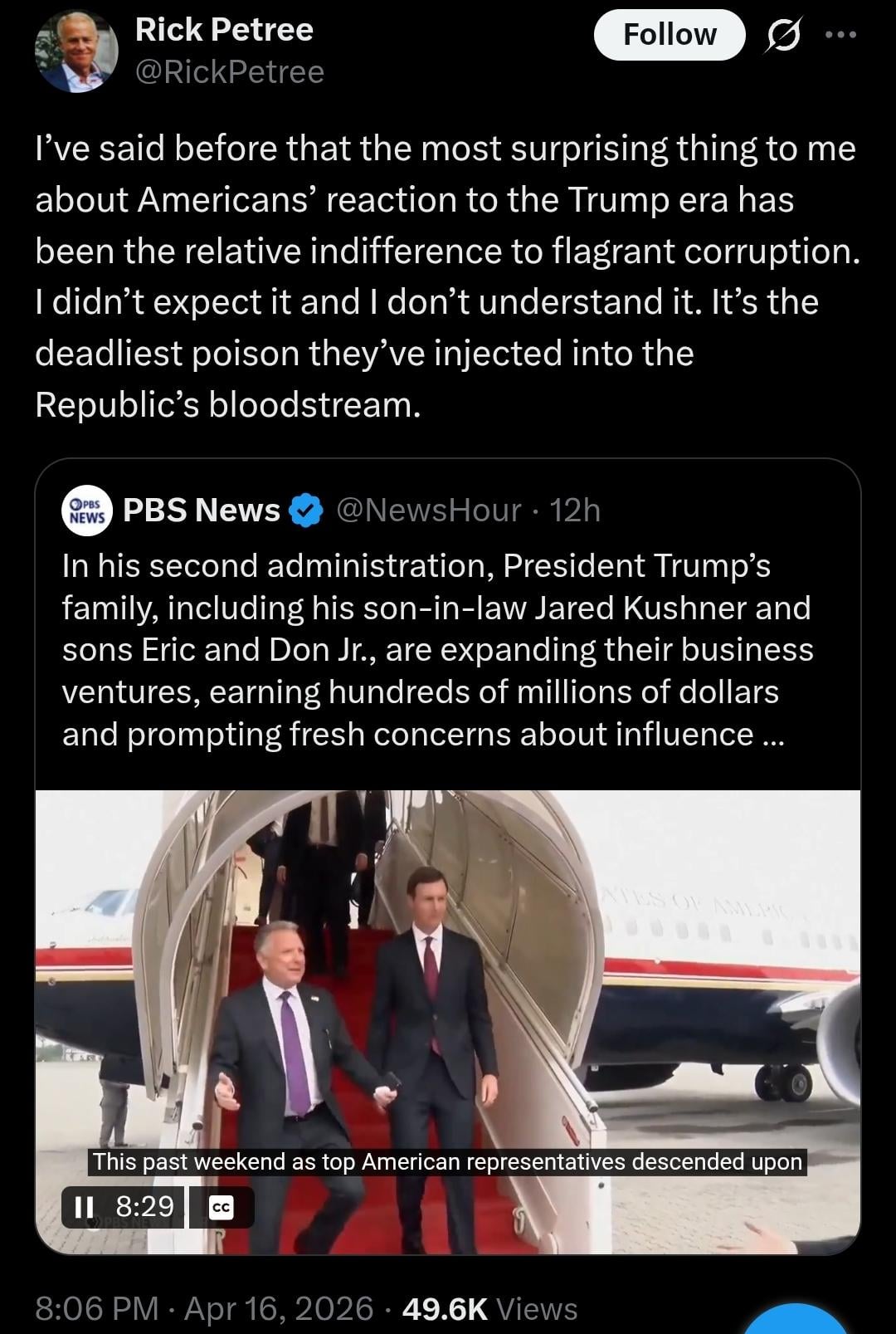 Everyone is missing the core point: it’s not corruption to them. it’s smart business moves. They LOVE how much money the Trump family is making off his power as president. MAGA’s real religion is worship of capitalism and wealth accumulation. This is why they loved Trump in the first place, 10 years ago on the escalator. Or even before as fans of his reality show, also about capitalism and wealth accumulation. MAGA is also about strict hierarchy. Rich people are on top of the hierarchy so everything they do to make more money is smart and good, and they can do whatever else they want too. This is how the Epstein files tie in.