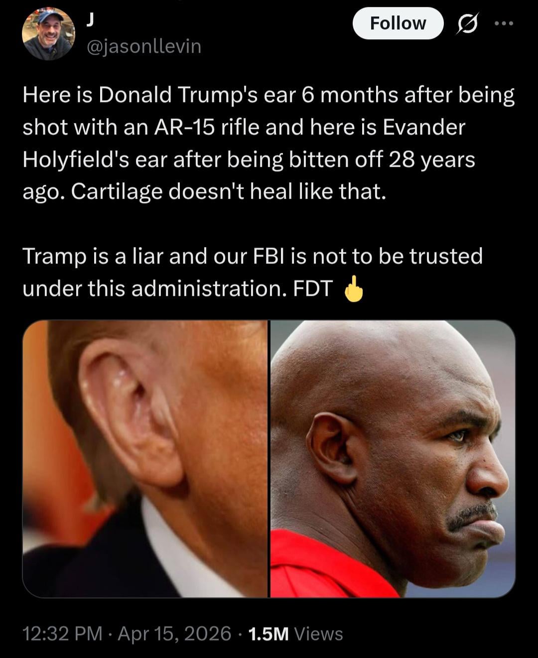 Trump has mastered DNA to regenerate ear cartilage at will. I’m not sure how you would get all this staging to work. We should investigate the guy in the crowd who died for this.