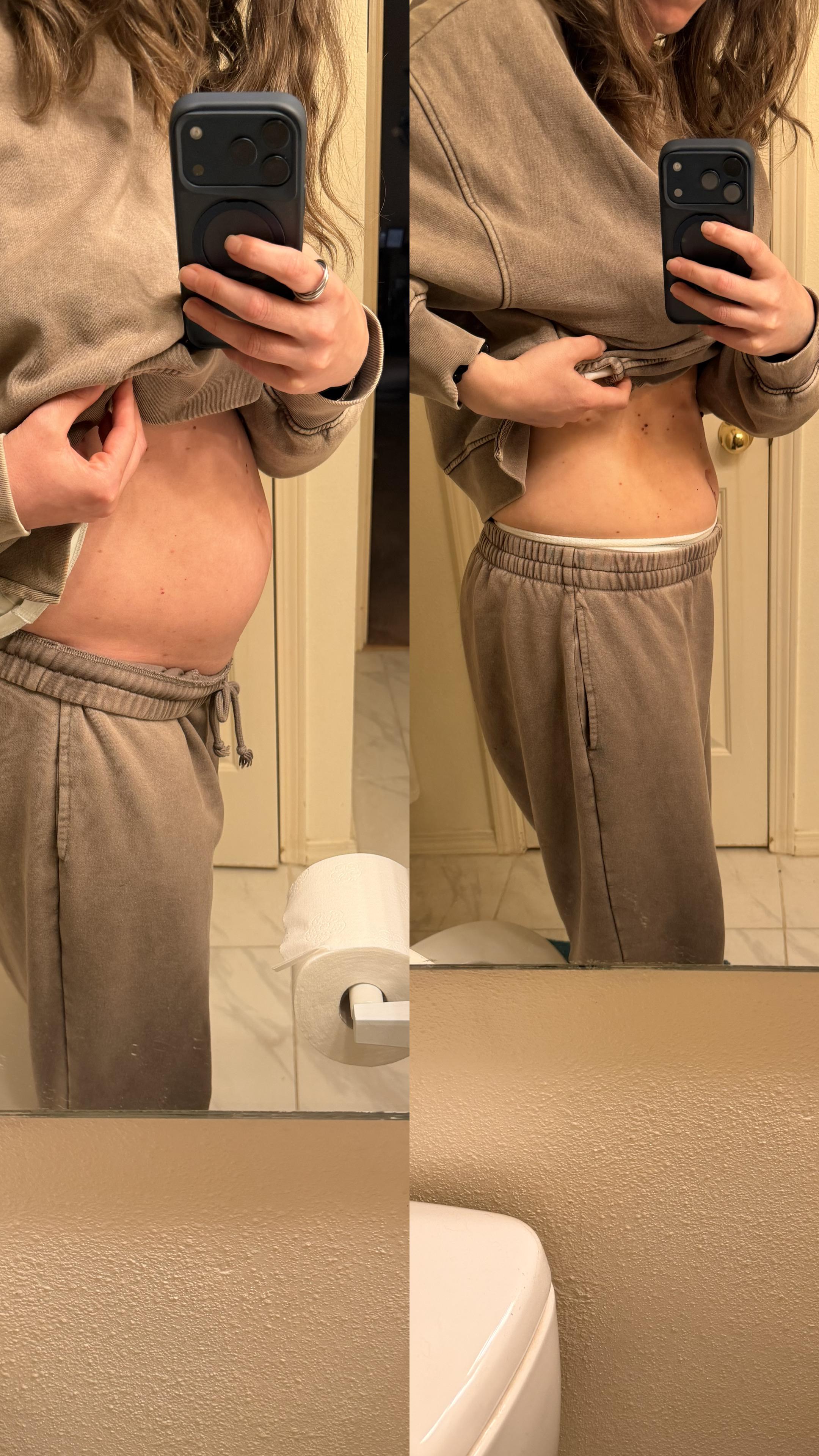 I had an ovarian cyst removed yesterday. It was filled with 5.5 liters of fluid which weighs around 12lbs. Left photo was taken last week, right photo was taken last night.