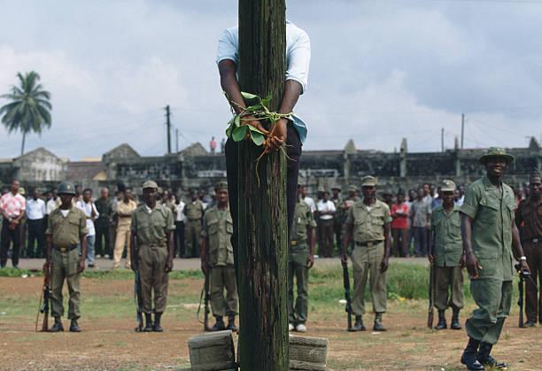A young Armed Forces of Liberia (AFL) soldier accused of looting and murder is bound to a telegraph pole before facing the firing squad. Photo by Patrick Robert (November 21st, 1992) [612×419]