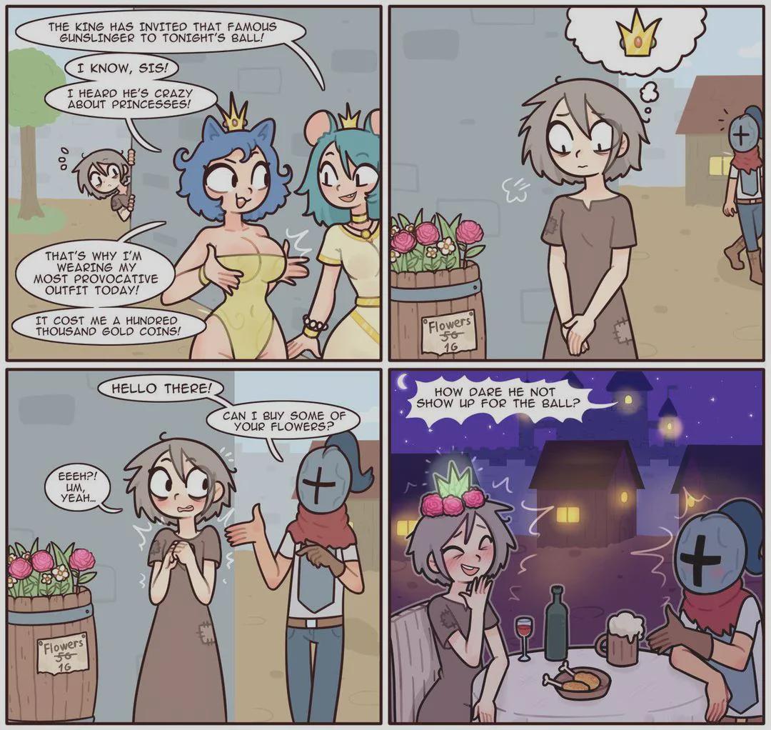 Knowing the artist, the girl has a dick and the gun slinger is gonna get topped in the next panel