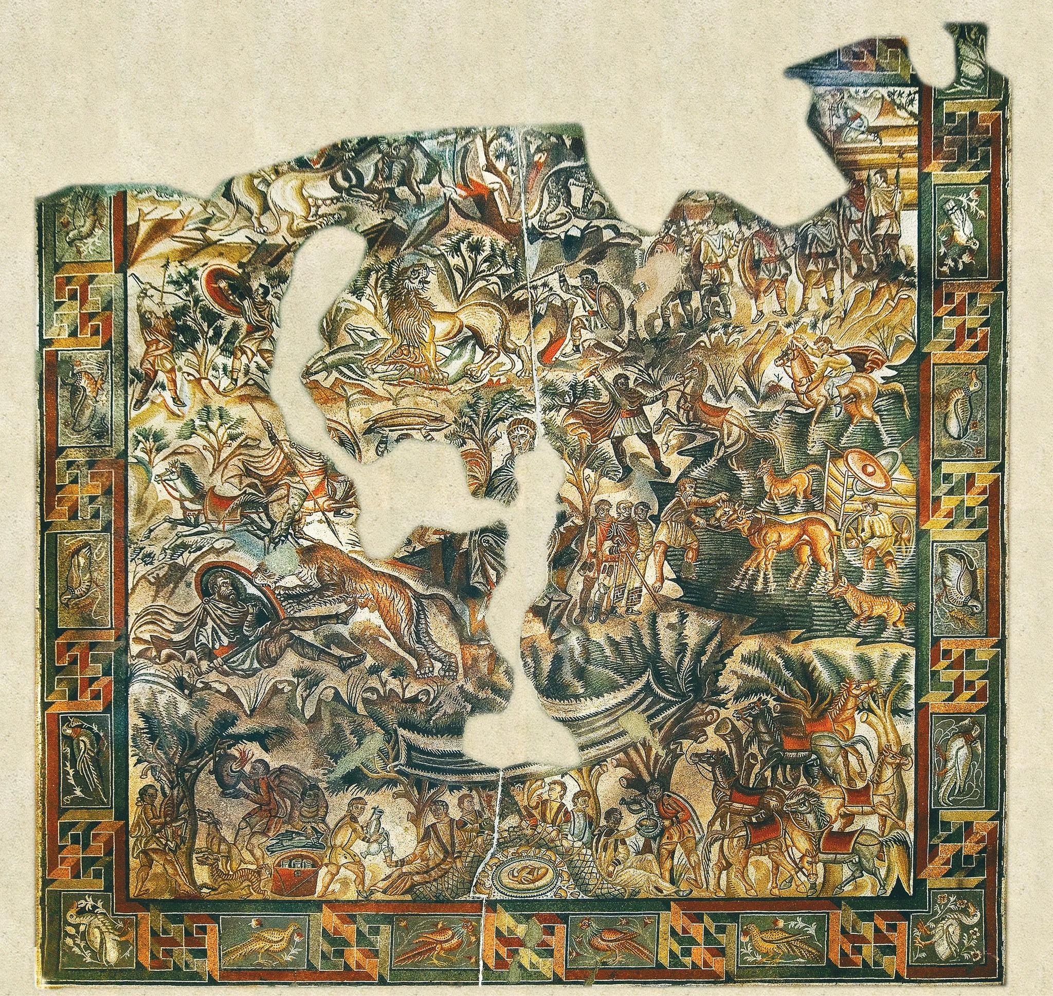 The Hunt Mosaic from the 4th century CE Villa Romana del Tellaro in Sicily, depicting a hunting scene with a banquet in the open air among the trees. The female figure in the center is the personification of Africa [2048×1937]