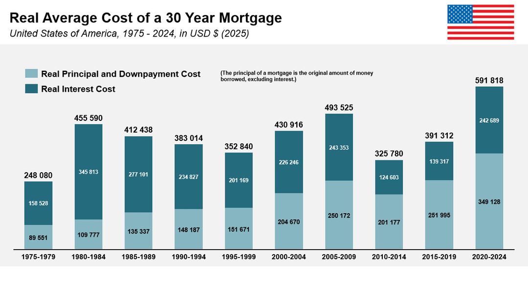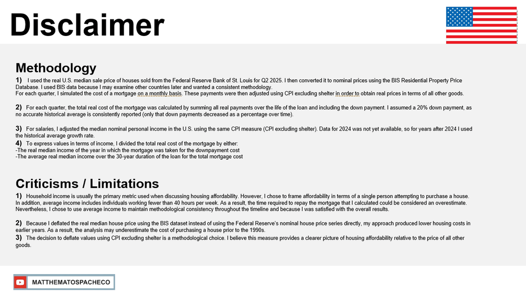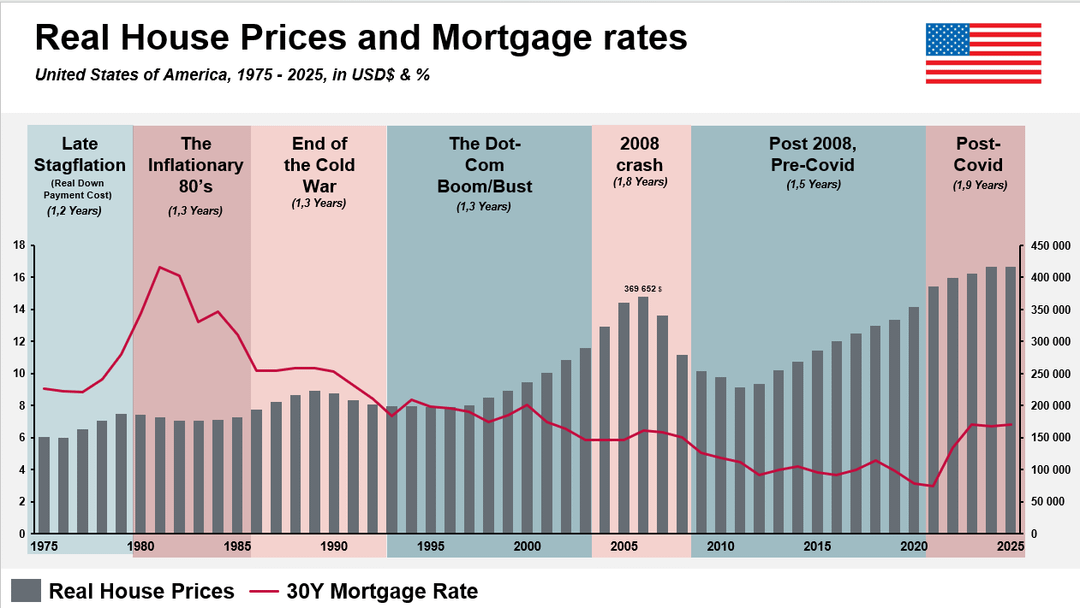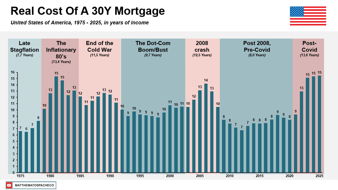 Basically this is the cost of a 30 year mortgage of the "typical housing stock" (BIS Dataset) if every payment was deflated based on the year of the payment. The time periods are personal choices that I found fit the data well, meant to situate the viewer, other events like S&L crisis, could of been used or even a year or to adjusted like 2021.