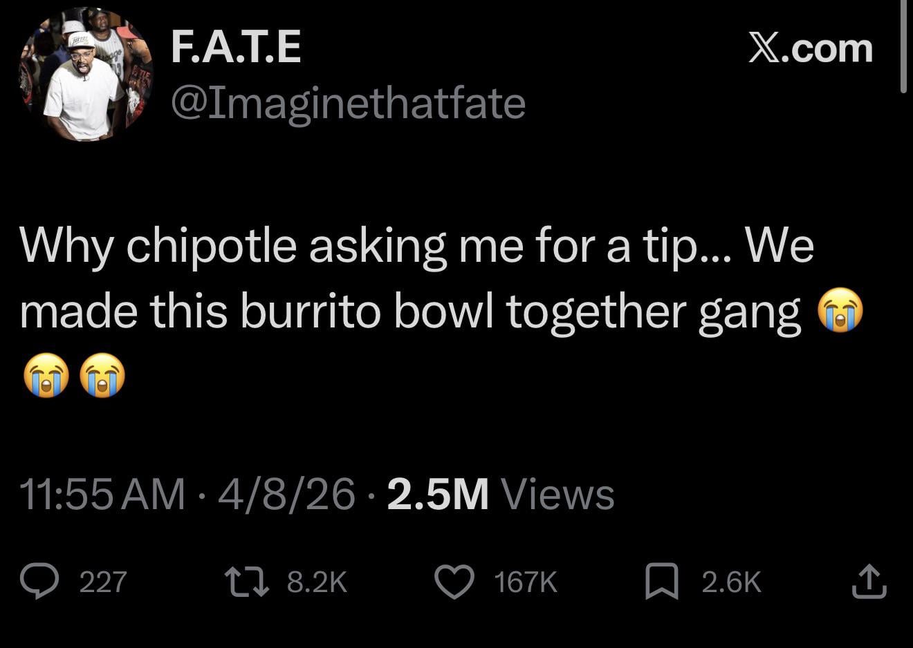 BritchesAndHose on April 18, 2026 6:40 pm Every time I’ve tipped ahead of time at Chipotle, my order’s been wrong. 😂