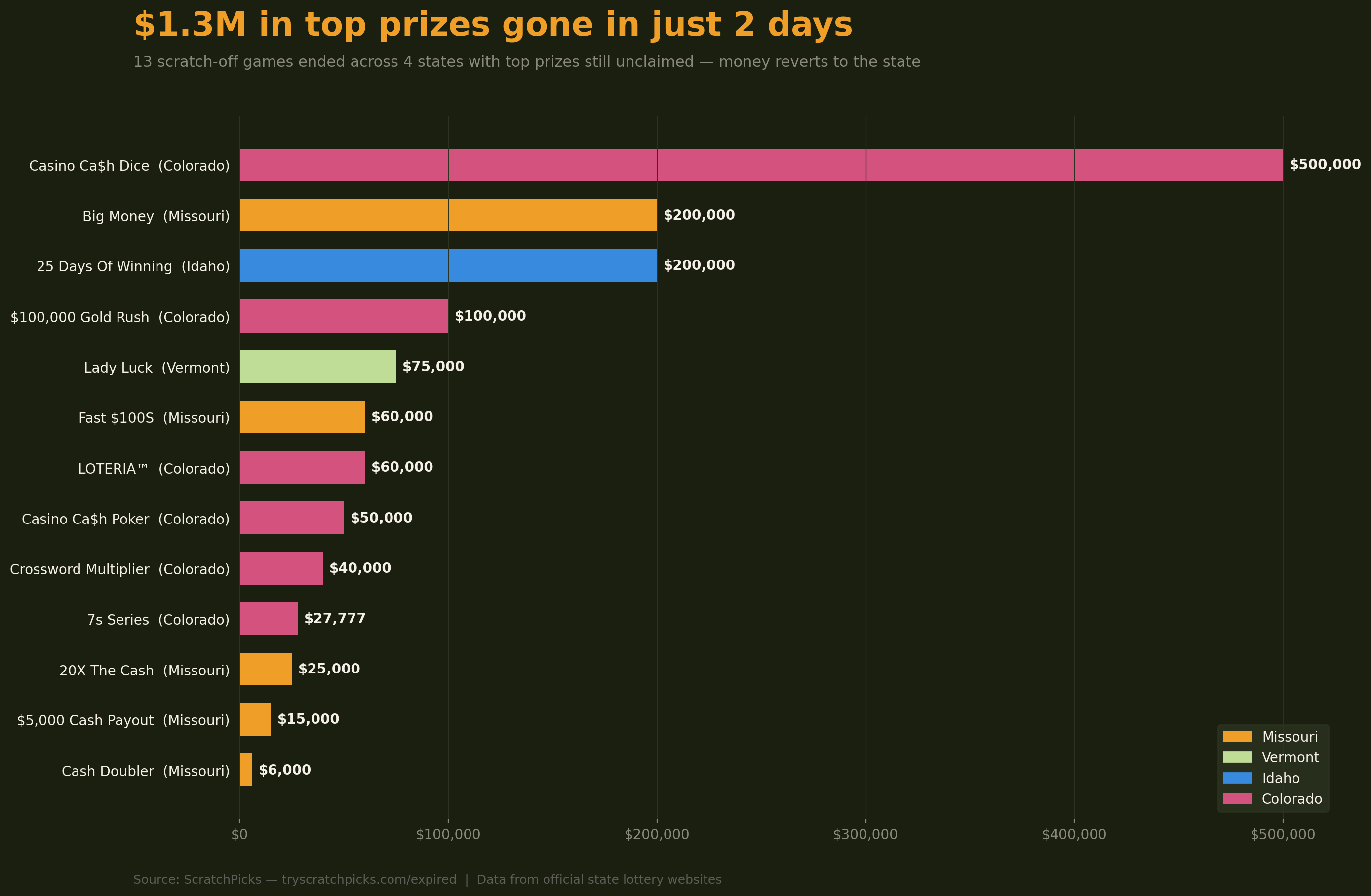 Data Source(s): Official state lottery websites for Missouri, Colorado, Vermont, and Idaho. Chart made with matplotlib.