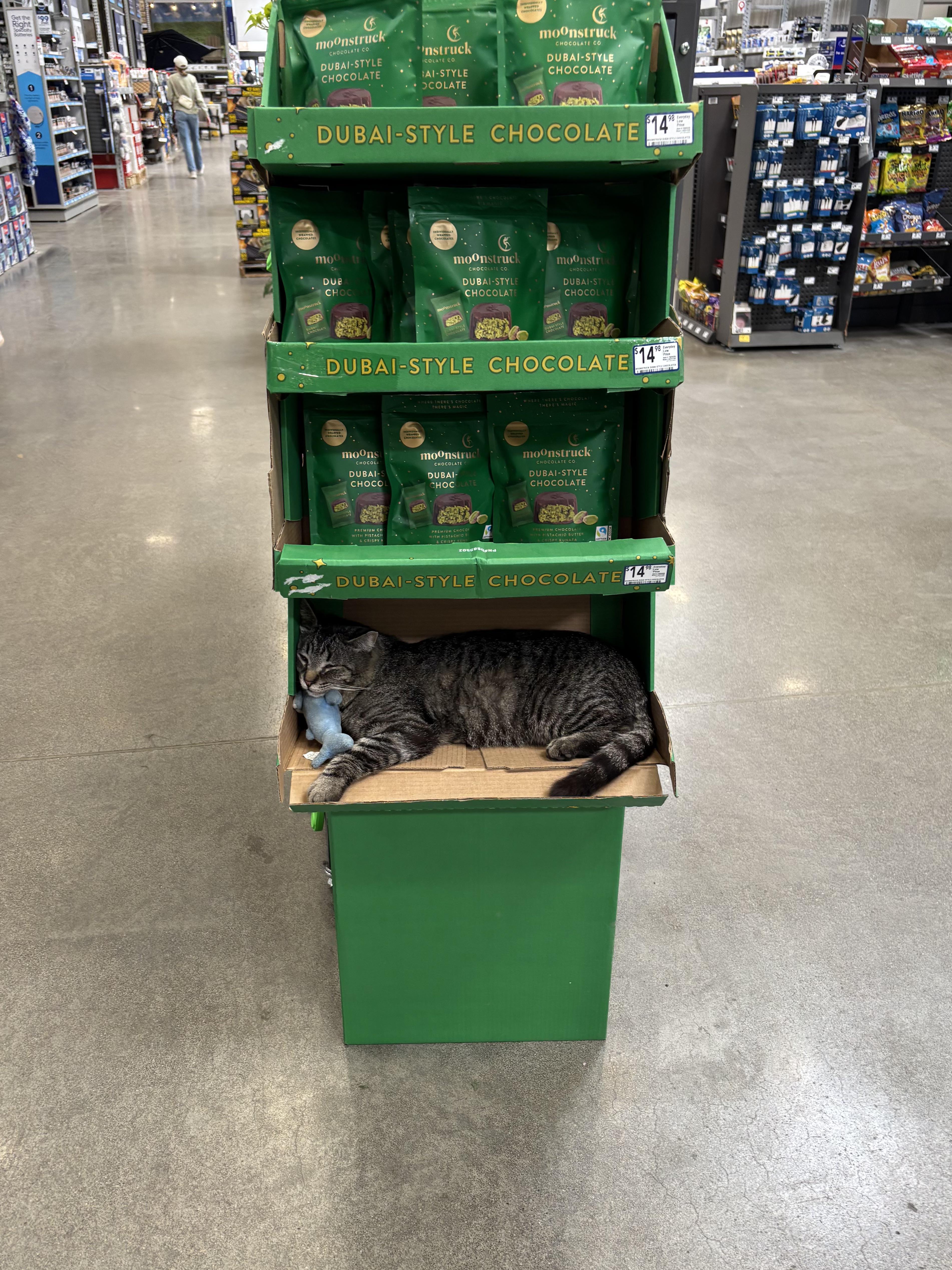 My local DIY has two! They have little beds on the cashier station!