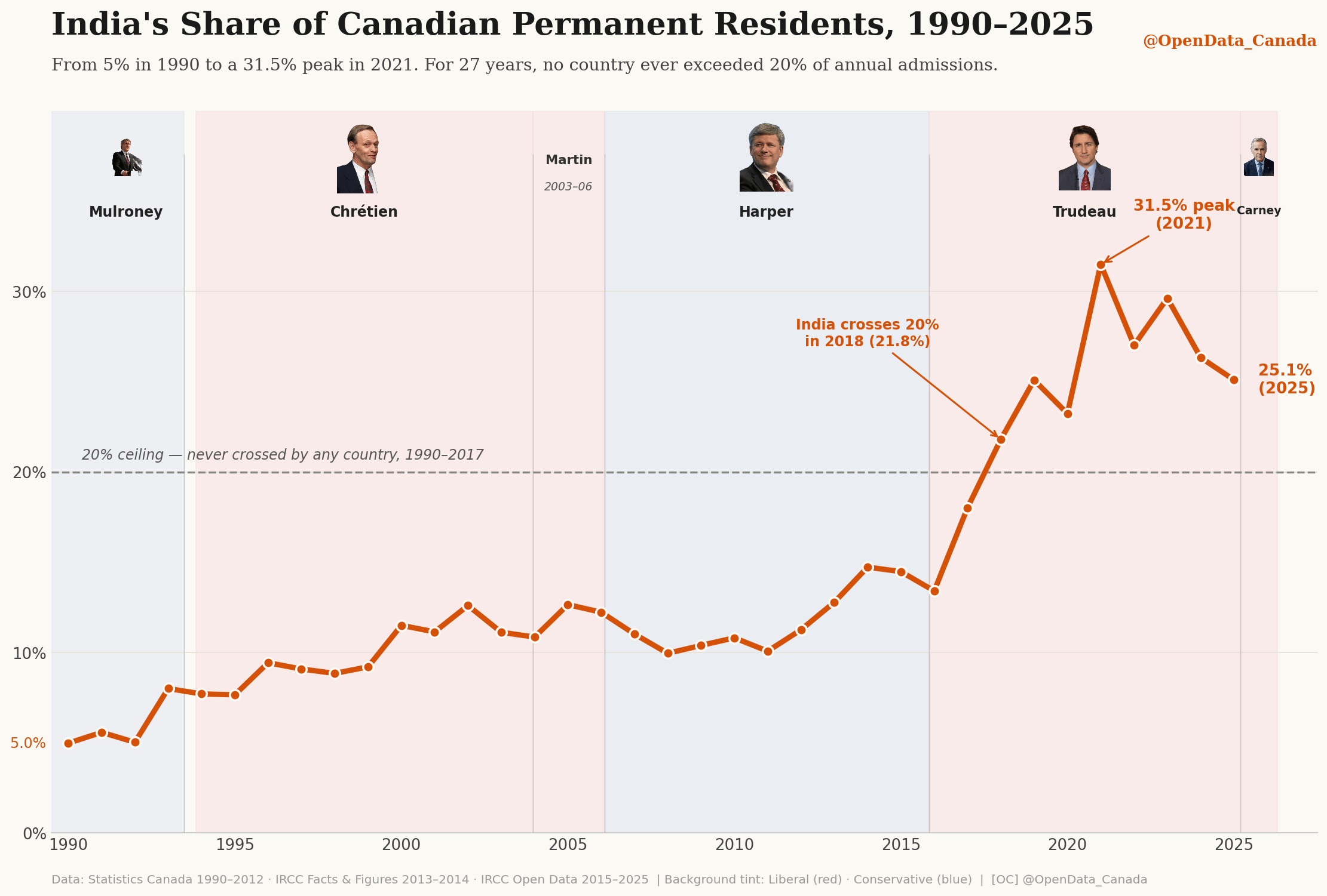 **Note:** Background tint shows governing party — red = Liberal, blue = Conservative. The dashed 20% line marks a ceiling no single source country had ever crossed in the prior 27 years. That changed in 2018.