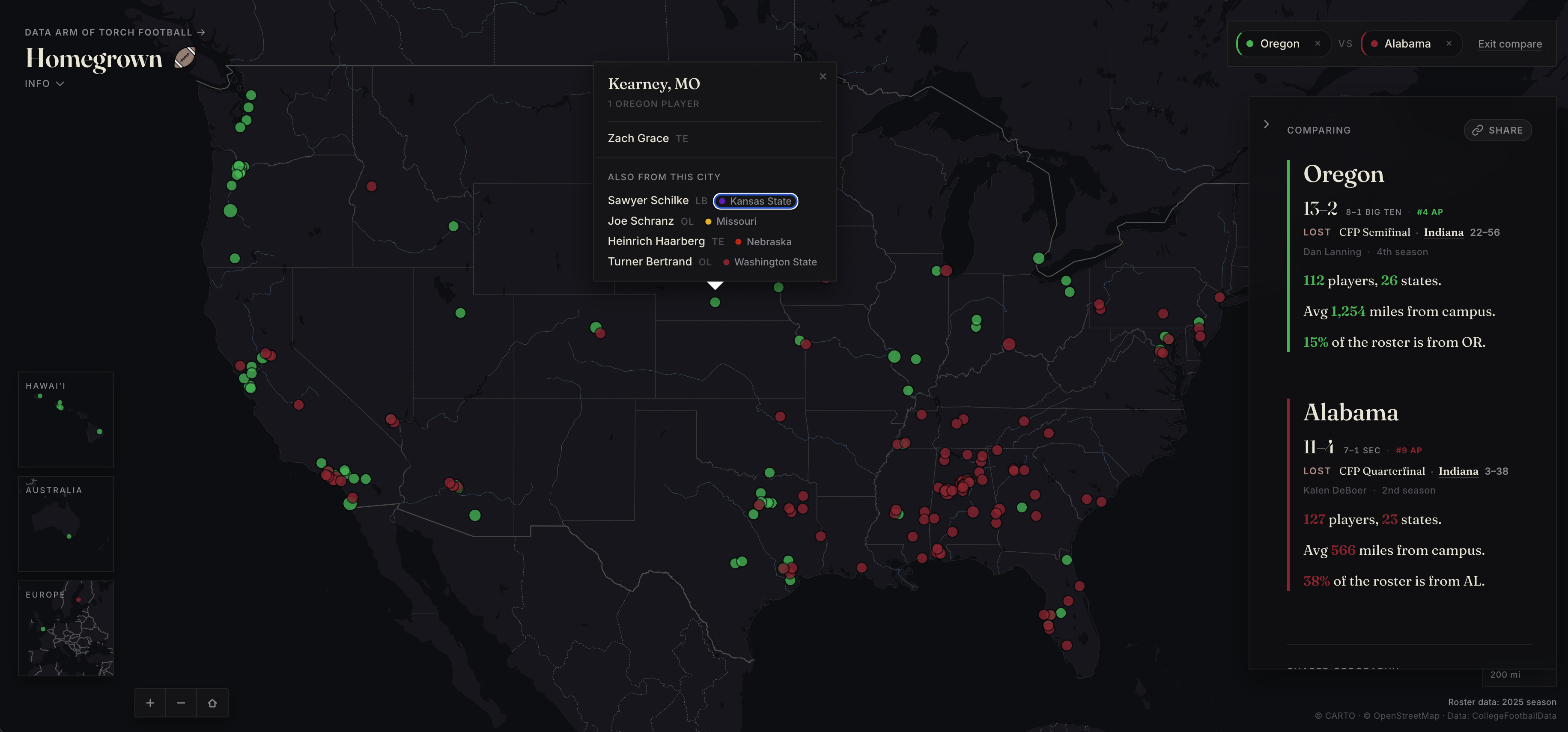 Building this out for the 2026 season — wanted to get 2025 live first. Data’s from CollegeFootballData. Any feedback or requests welcome. Next I plan on adding a state-by-state breakdown and position breakdown. Any feedback is welcome. Just a fun little project. Hope it’s interesting to some people.