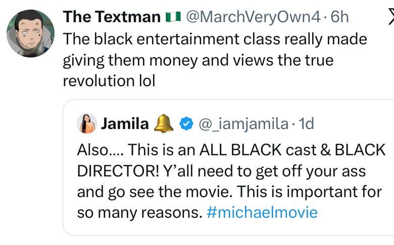 6. I don’t think the original tweet is framing it as a revolution vs pointing out the fact that if you want to see more Black films being made you have to support the Black films in theaters. We can’t complain about Tyler Perry being the only Black director options when we don’t support the other Black films that are released.