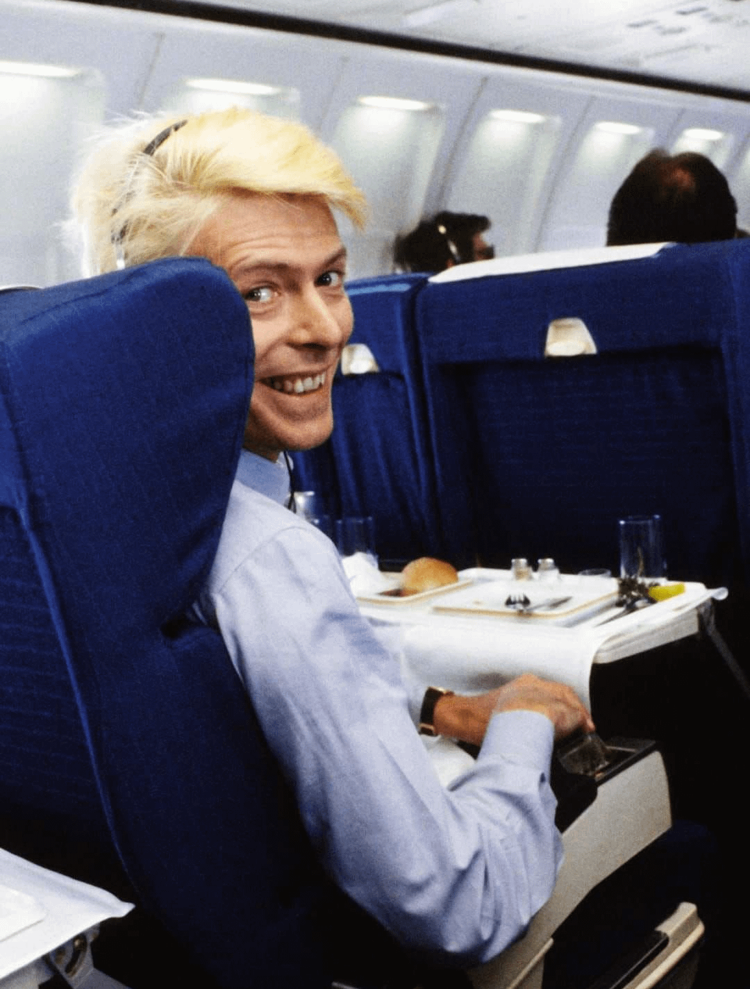 Even in 1983 economy, he’s got more legroom and a better meal than modern first class. The Thin White Duke making a coach seat look like a throne.