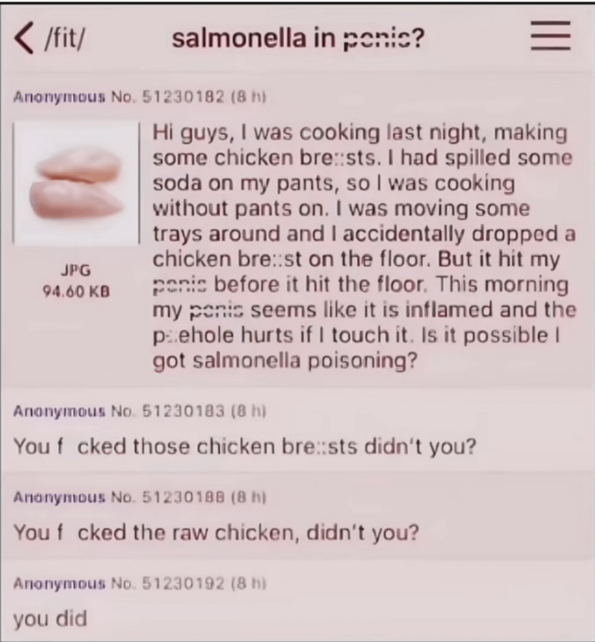 I think bro did fuck the chicken.. its said this is where necrophilia begins.. but he is dissatisfied with the status of his penis.. so maybe he won’t become a necrophile..