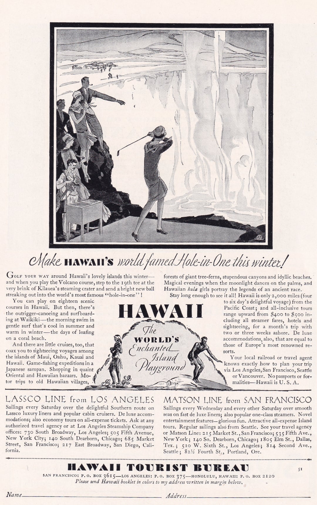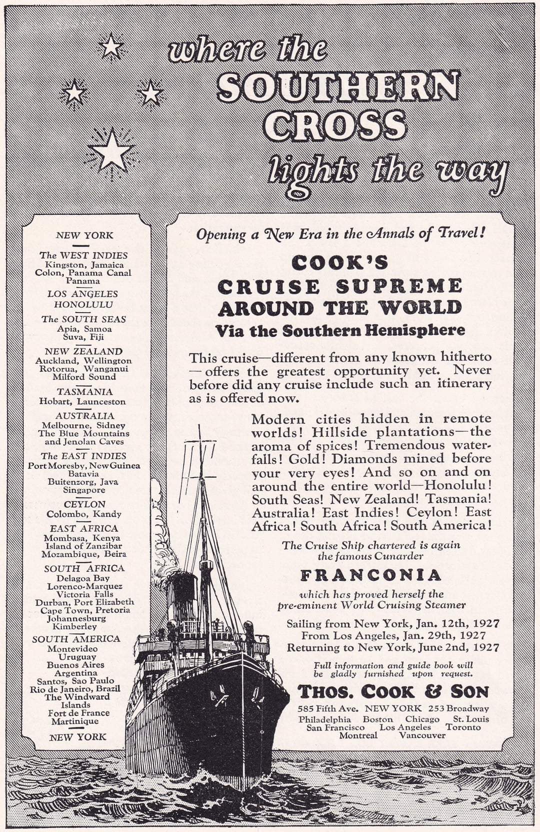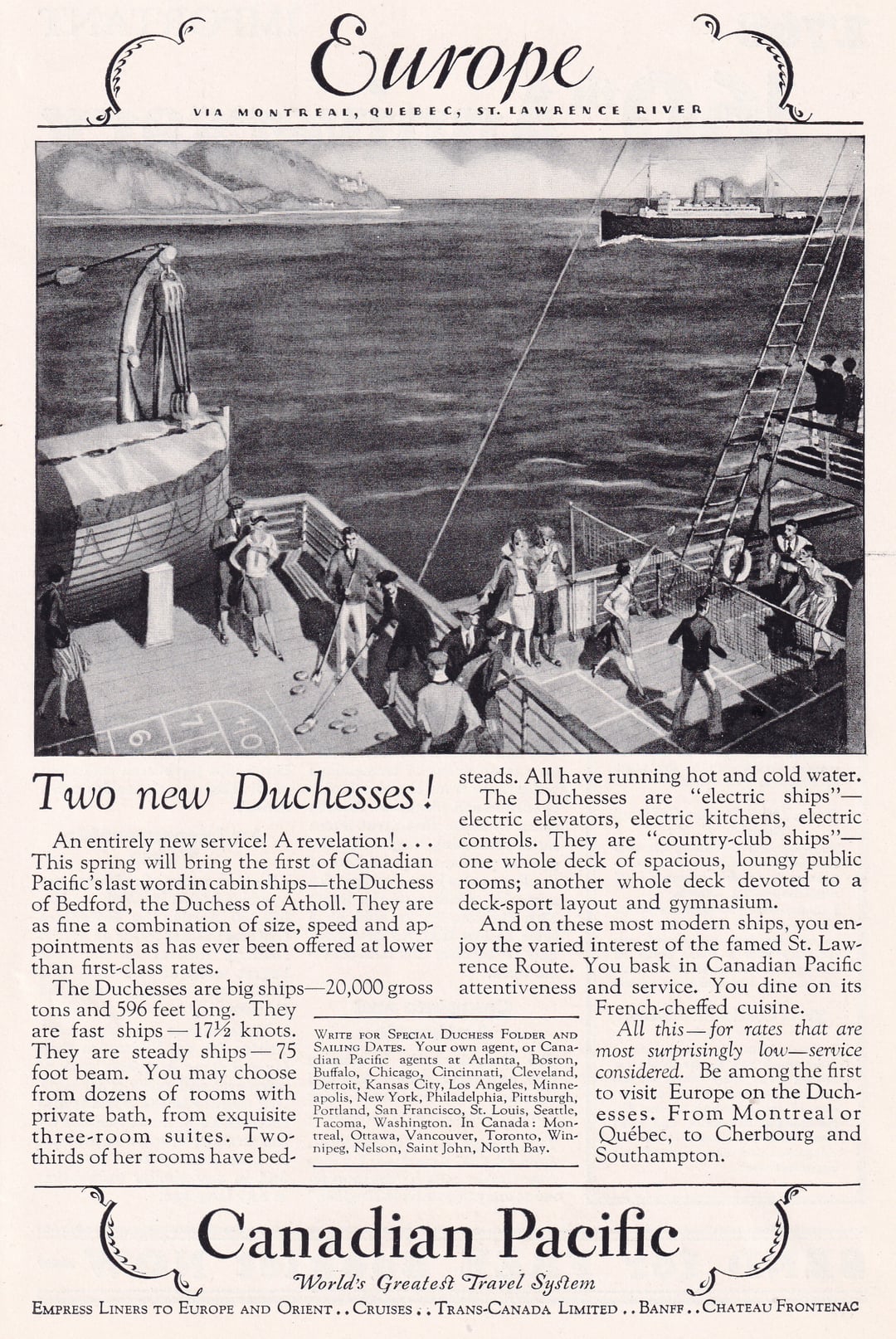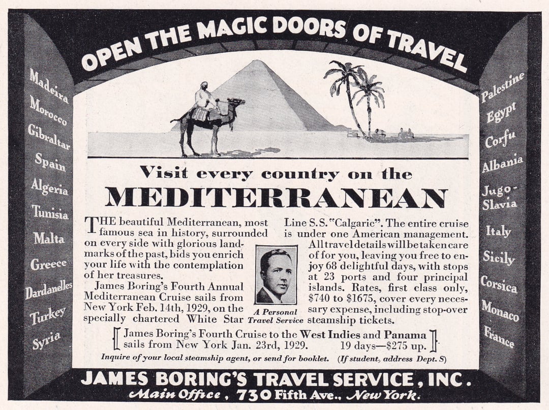 Late 1920s travel ads – Open the magic doors of travel, hit a golf ball into a volcano, two new Duchesses, and a one cruise around the world. by takeyoufergranite