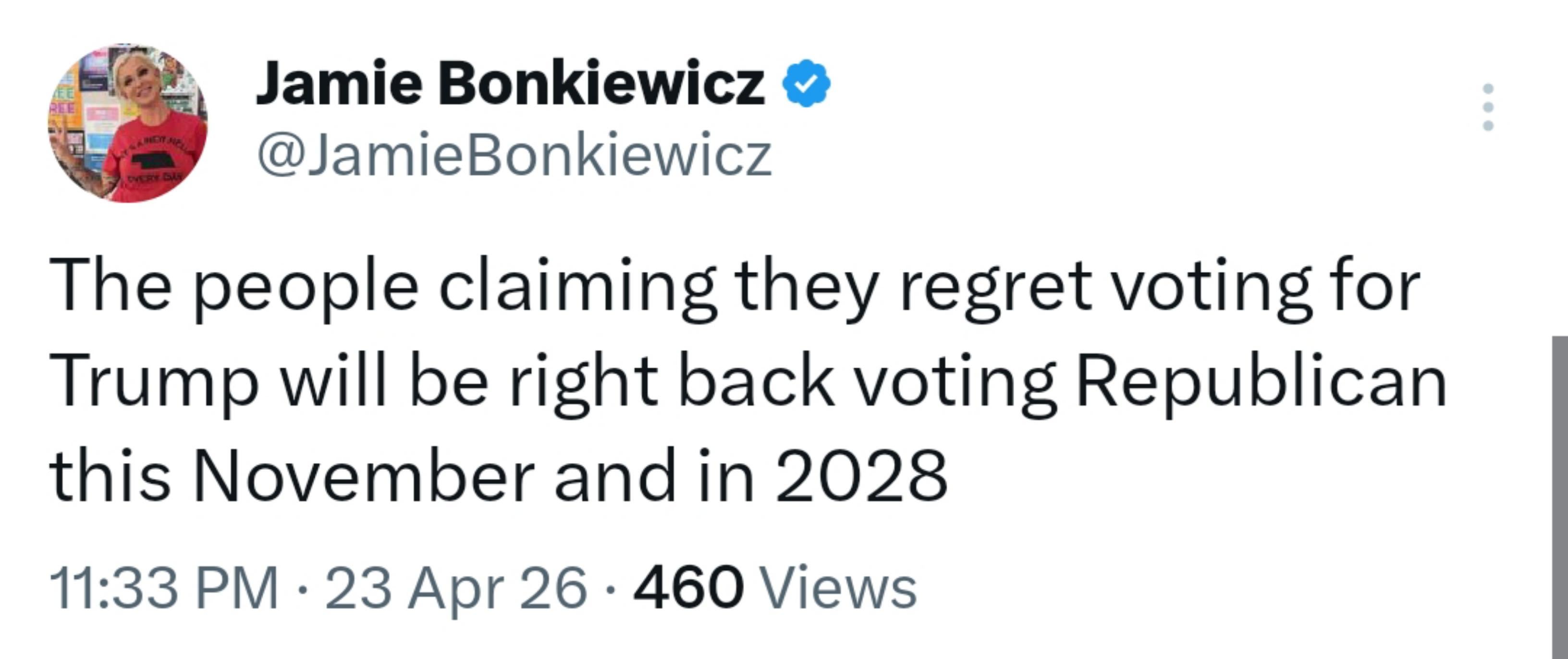 What they mean when they say they regret voting for Trump is they regret their gas, grocery, and electric bill and they hope next time around, there’s someone roughly 10-15% less chaotic than Trump to vote for.