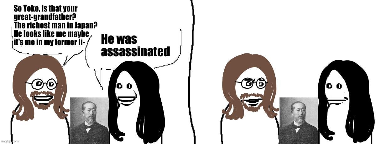 48 years later, Zenjiro Yasuda’s great-granddaughter, Yoko Ono, got married to John Lennon. According to some account, upon seeing Yasuda’s photo, John said “*That’s me in a former life!*” and Yoko replied “*Don’t say that, he was assassinated*”.