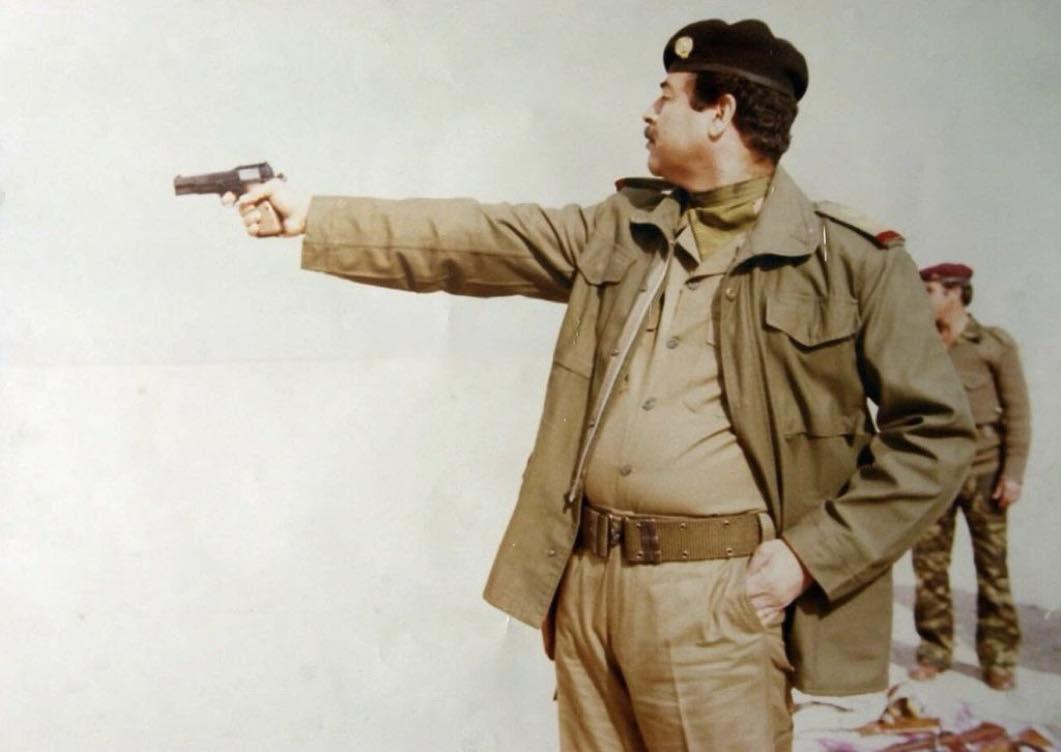 Iraqi dictator Saddam Hussein firing a pistol, 1980’s. Saddam, who grew up in extreme poverty in rural Iraq, claimed to have been experienced with firearms since he was a child (1061×752)