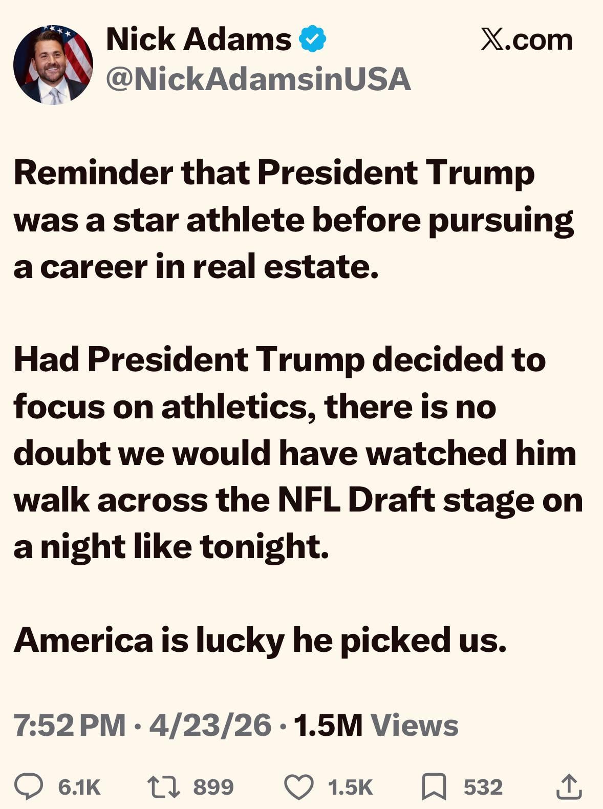 The average age of a NFL player is 27…. Trump was 27 in 1973… They didn’t start airing the NFL drafts on tv till 1980… So no, we would have never watched him go across the NFL draft stage on TV even if he had persued sports…
