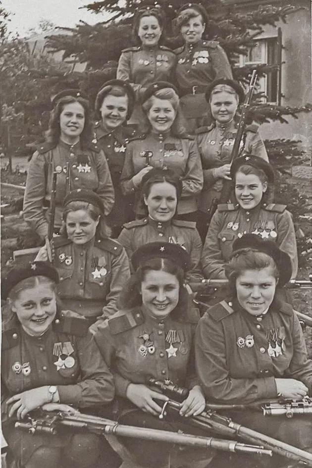 2nd row – Guards Junior Lieutenant E.K. Zhibovskaya (24 kills), Guards Senior Sergeant K.F. Marinkina (79 kills), Guards Senior Sergeant O.S. Maryenkina (70 kills);