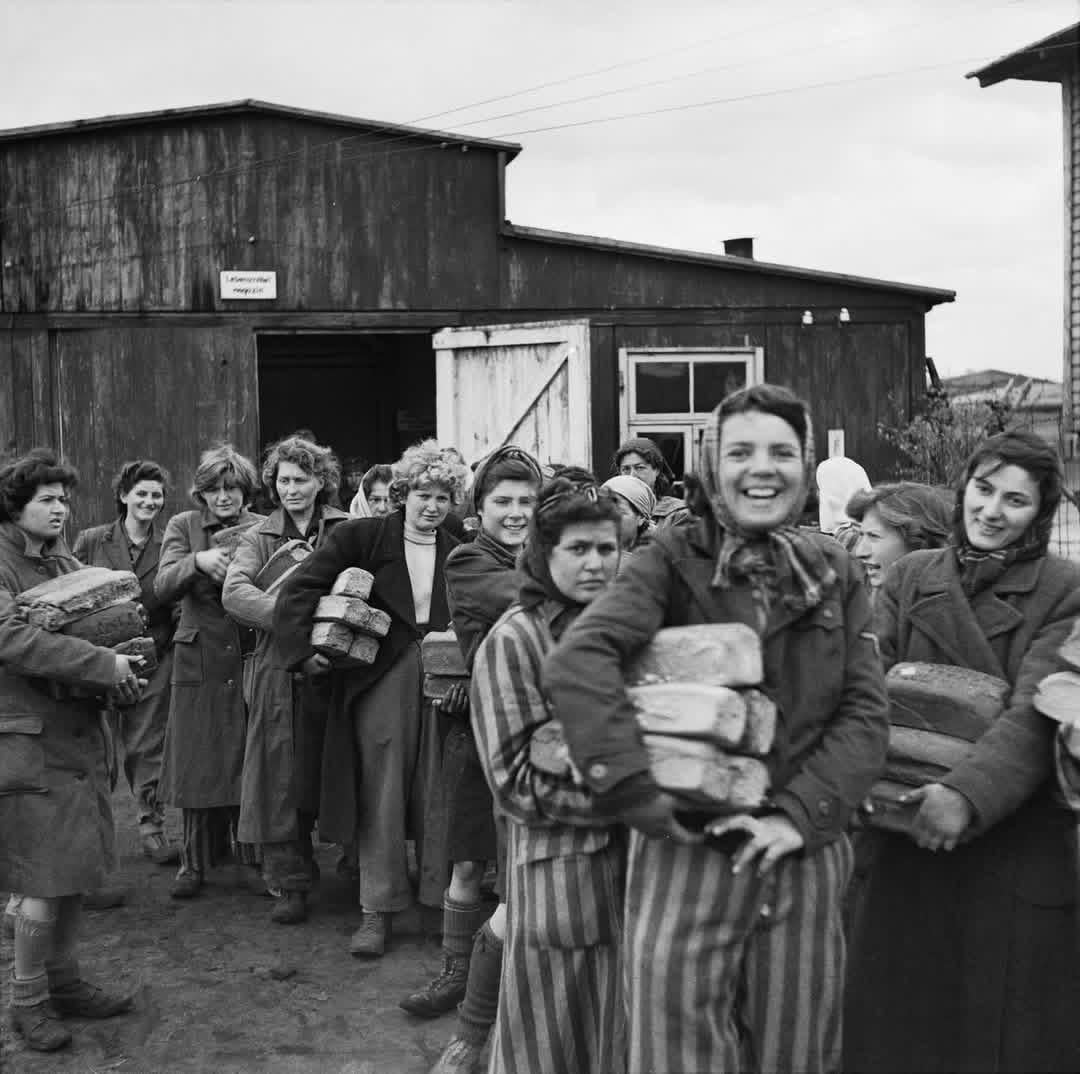 Liberated women inmates at the Bergen-Belsen Concentration Camp get loaves of bread from one of the five camp cookhouses – 24 April 1945. Sgt H. Oakes, Photographer. [1080×1074]