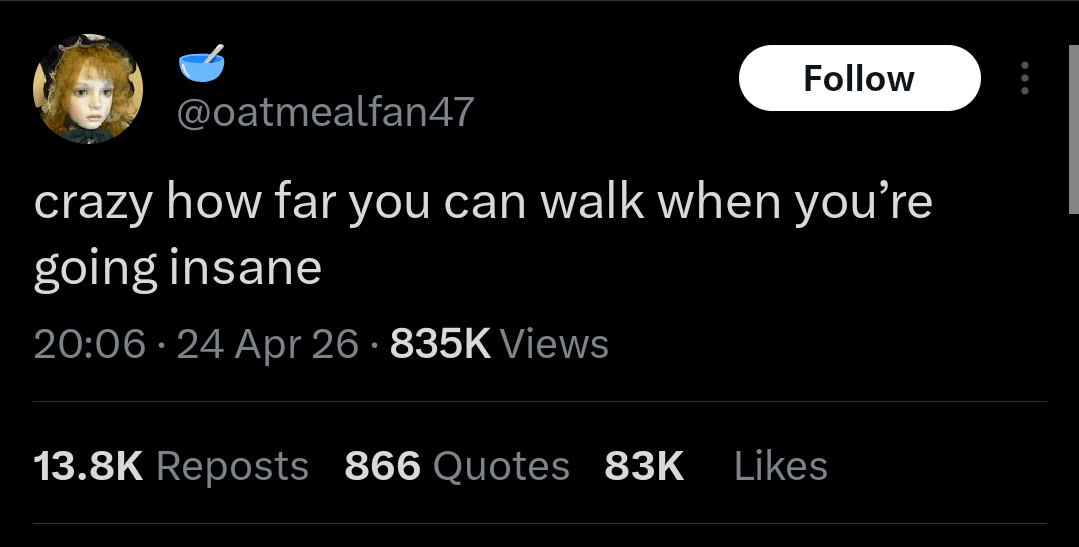 I have ptsd, adhd, shitty job, fat, deal with beratement landmines all day, but damn can i walk and get lost in nature / the breeze outside, maybe with some music for hours.