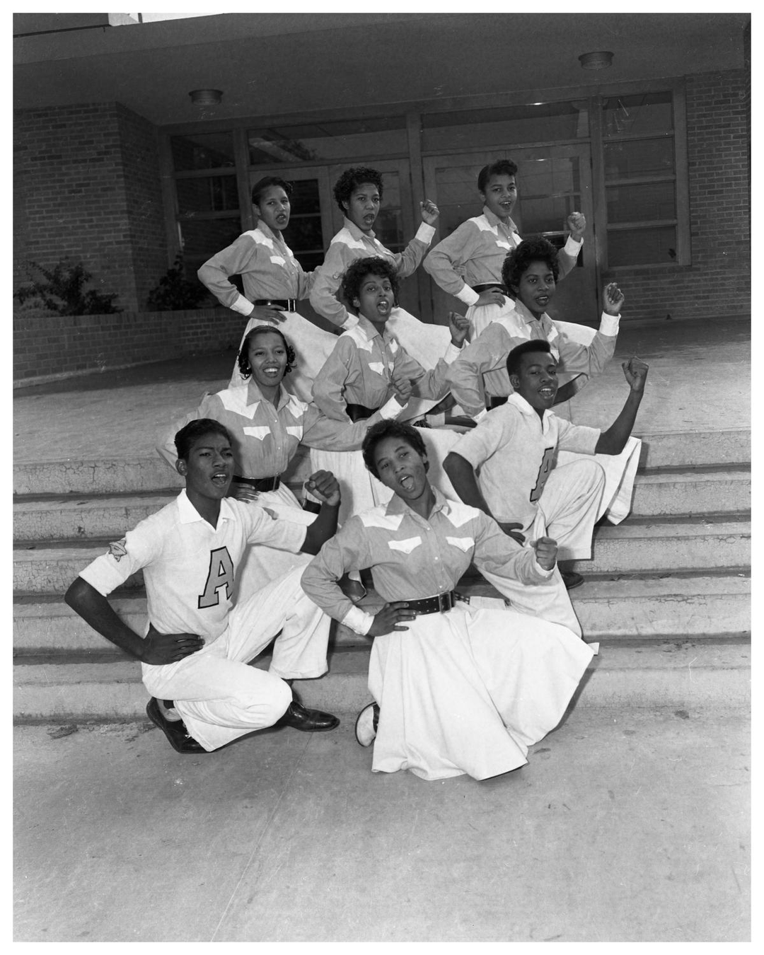 Share Facebook Twitter LinkedIn Pinterest Bluesky Threads Cheerleaders pose for their group portrait, Anderson High School, 31 of October 1955. by Electrical-Aspect-13