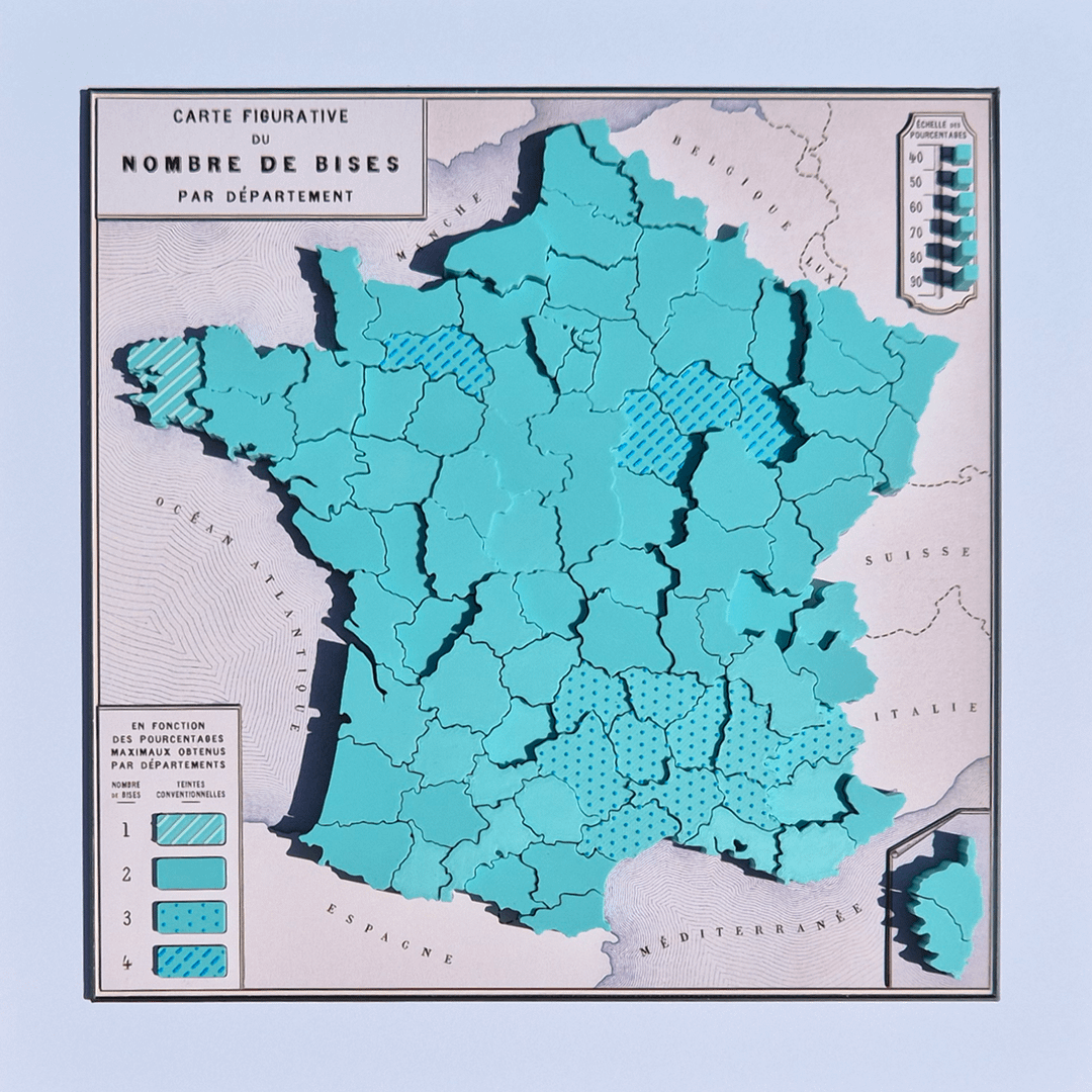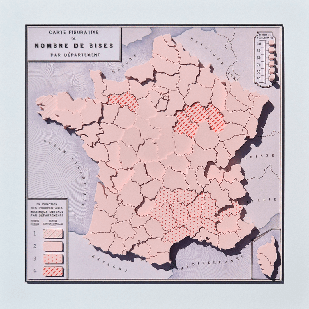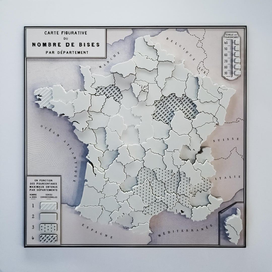 The surface colour/texture denotes the number of kisses bestowed by a plurality of residents in each department—from one to four—and the height is the percentage of that plurality. Modelled in TinkerCad, printed on an A1, data from http://combiendebises.free.fr/