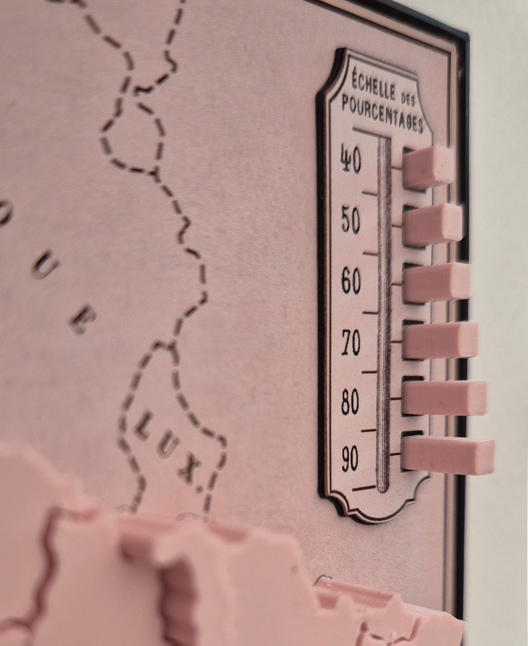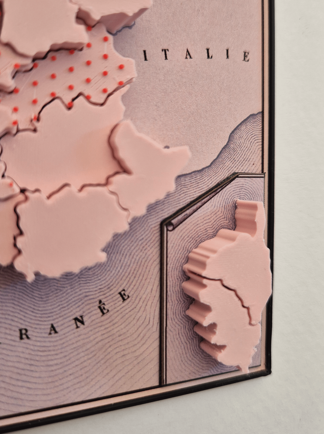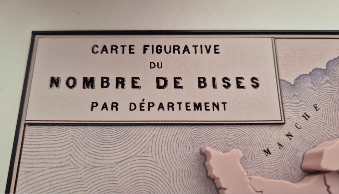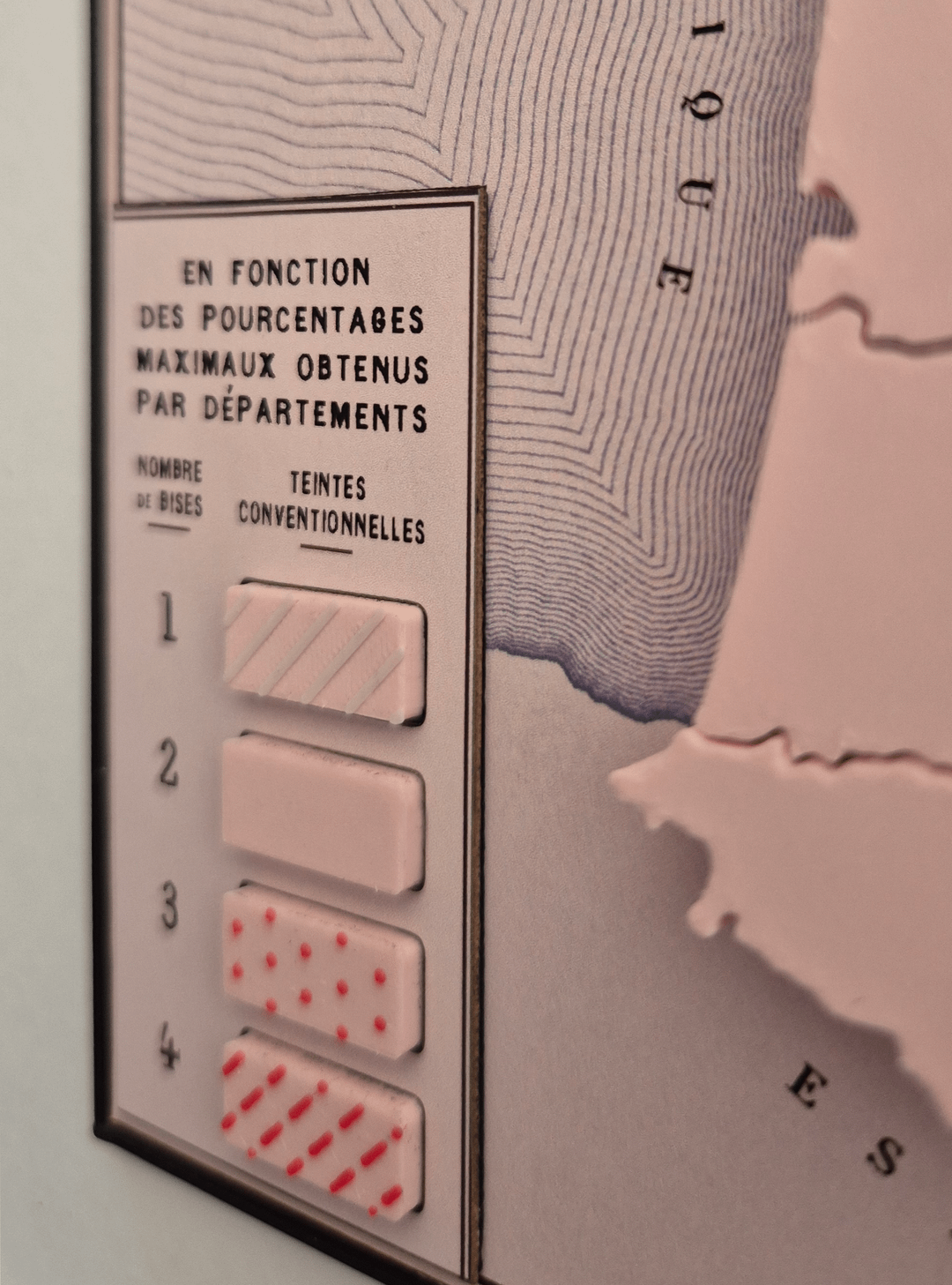 There's also a bit of compromise on data comprehension regarding the one-kiss department in the north-west (Finistère). It's quite hard to distinguish it from two-kiss departments, in photographs at least, but because I wanted to make these maps in different colours, I knew it was unrealistic to have a light main colour and an even lighter colour just for Finistère because PLA (the 3D filament) doesn't come in that many colours. Also, adding textures with a 3D printer is tricky as you kind of need them all to be on the same layer so I needed a single textureless "base colour"—pink in the main photo—for the many two-kiss depts and I thought it reasonable that more kisses should have more colour/texture. So, three kisses have the red dots (a bit more colour than just pink) and four kisses have the red dashes (even more colour). That left me needing to find some other way of "lightening" the only one-kiss department. I went with white stripes, which are intended to lighten the pink, but I'm not sure it totally works—all feedback welcome.