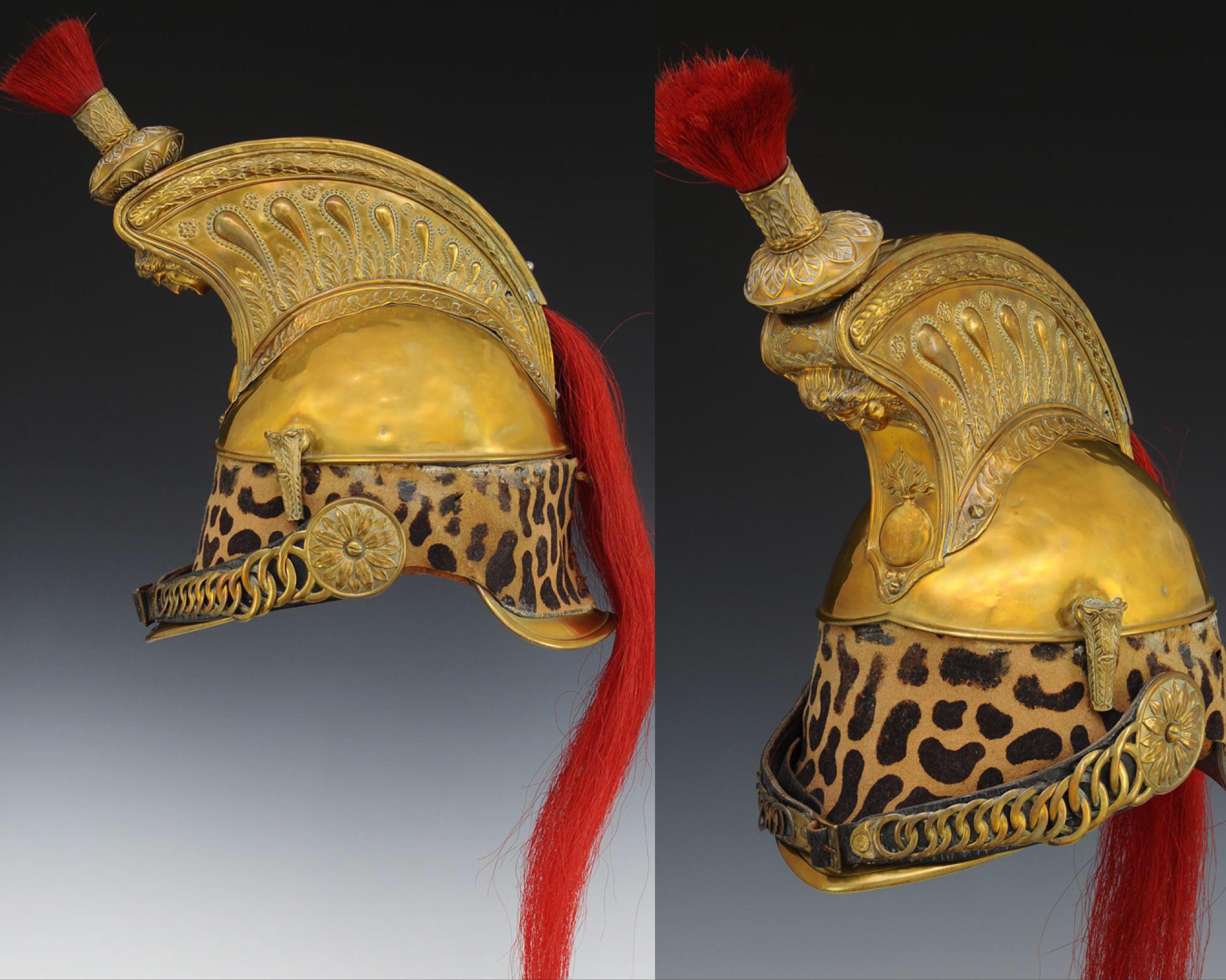 The concave-based fins, which form a scalloped edge pierced with two screws in copper, round suet drop-head, which are secured inside the shell with nuts. They are adorned with palmettes and a garland at their upper edge. The rim is decorated with water leaves, all embossed. The mask serves as the anterior joint to the two fins. It is embossed with a relief head of Medusa, topped with a small oak wreath, and at the bottom, above the mask’s lamp base, is a grenade in bas-relief. A copper screw at the base of the lamp base. The copper cover is embossed with a relief braid. The ornament of the crest consists of a lower socket, a lens decorated with relief palmettes, and an upper socket, also embellished with palmettes. A scarlet horsehair plume.