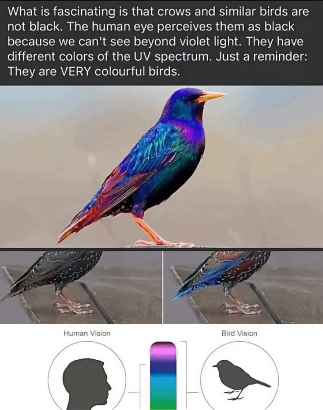 The kernel of truth is that many bird species DO have UV-reflective plumage patches that aren’t visible to humans. But crows are specifically one of the exceptions. So it’s a case where the interesting fact is real but got attached to the wrong animal because “black bird is secretly rainbow” is a compelling narrative.