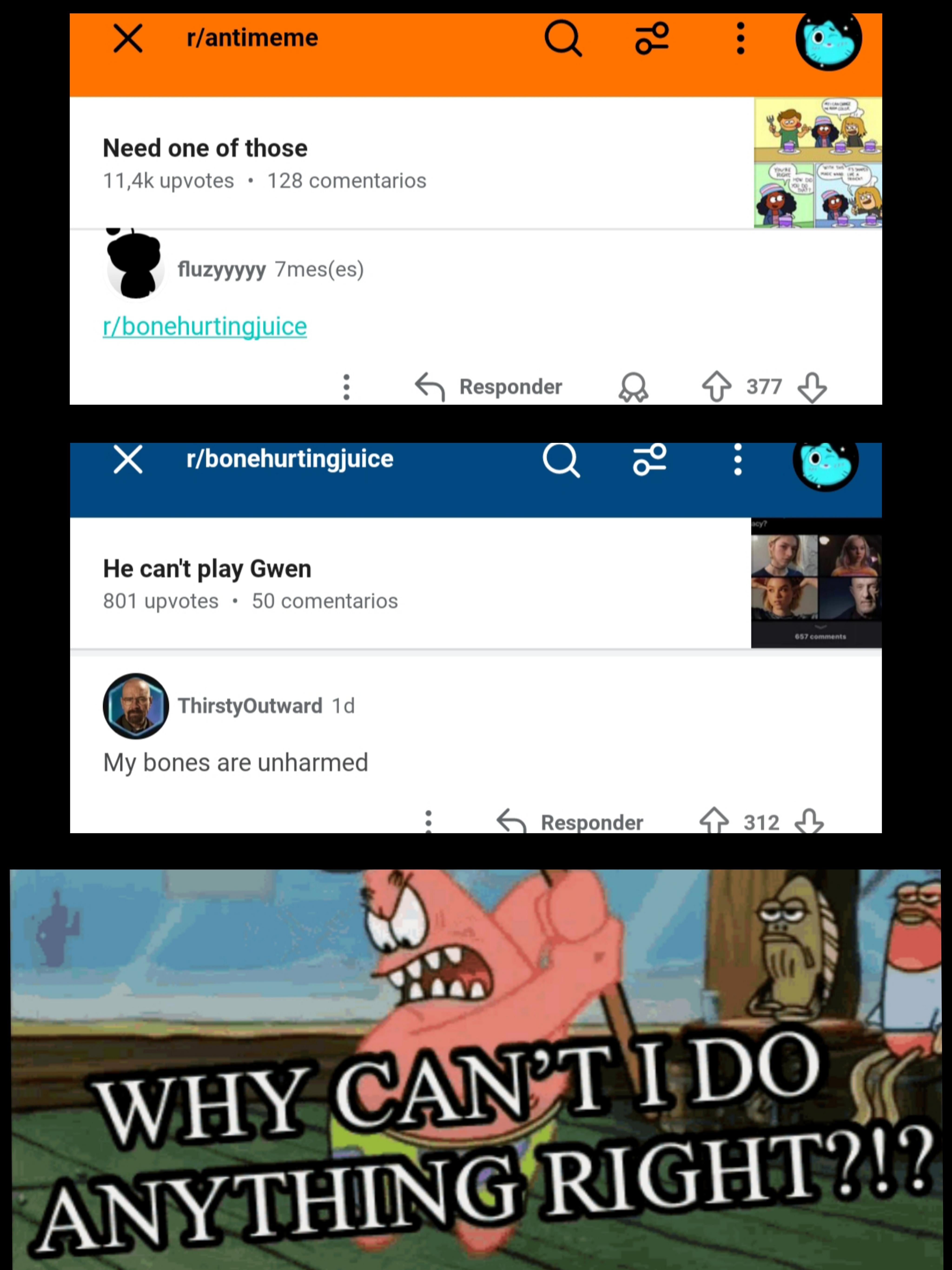The struggle of balancing r/antimeme and r/bone hurtingjuice is real. Getting roasted by both is a special kind of pain. Patrick gets it