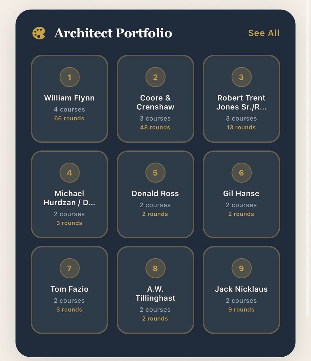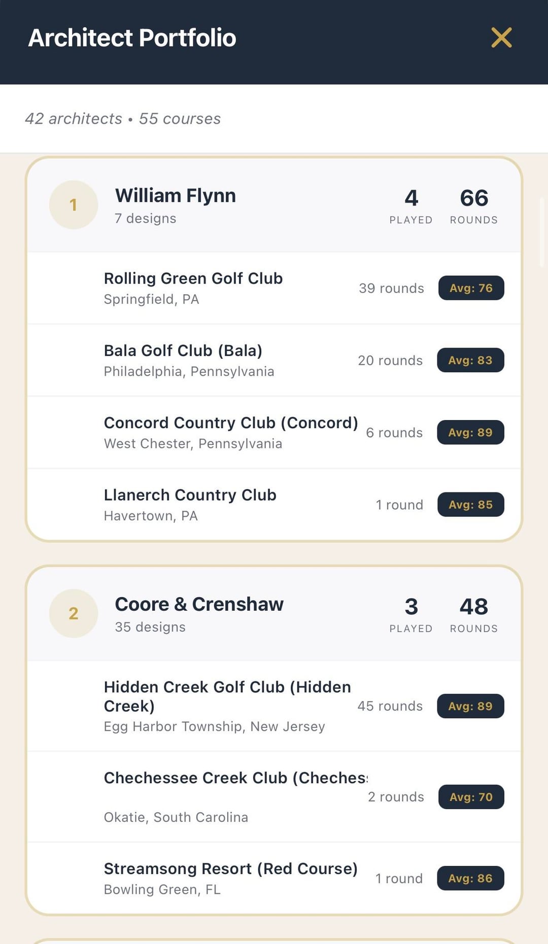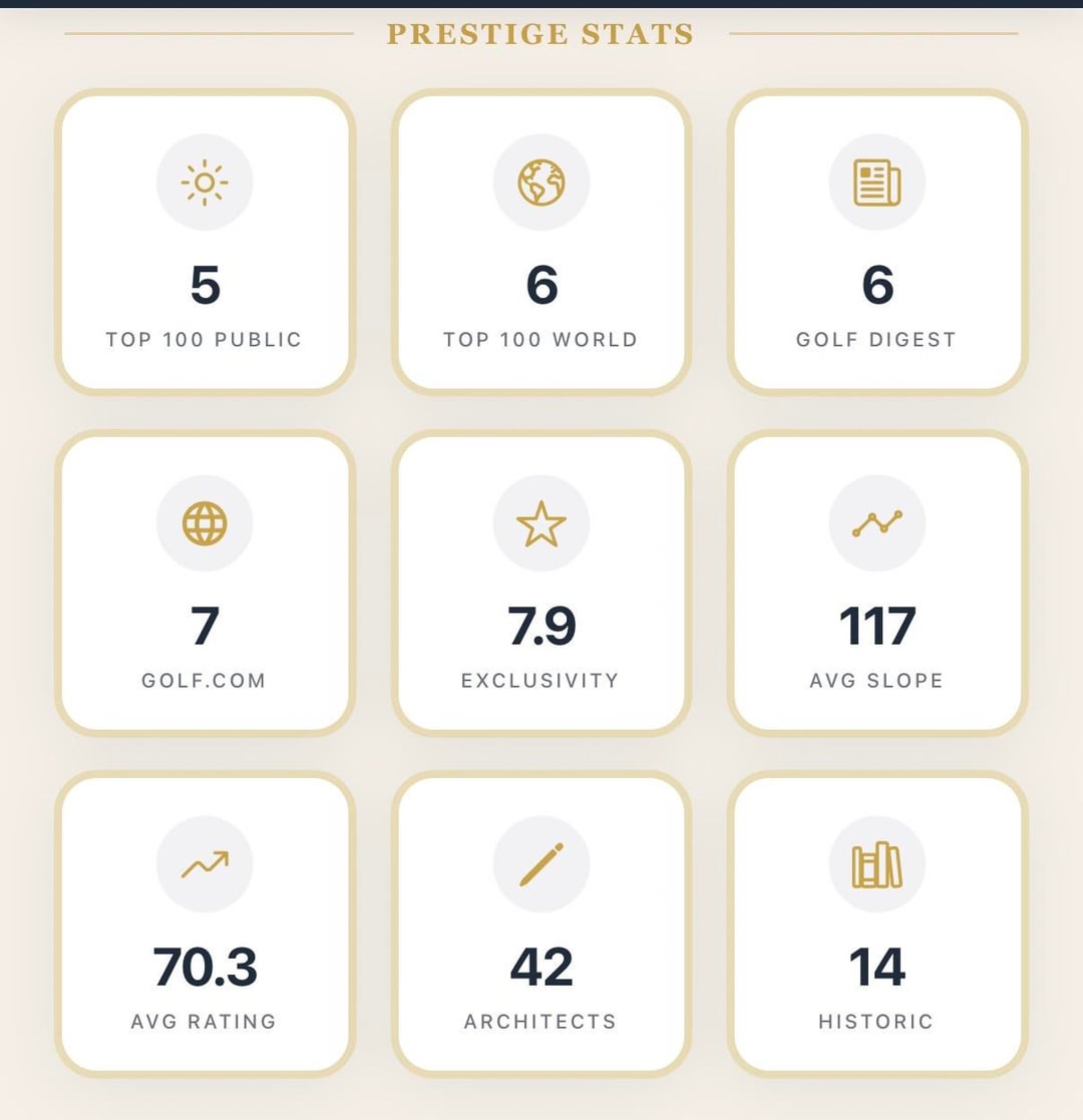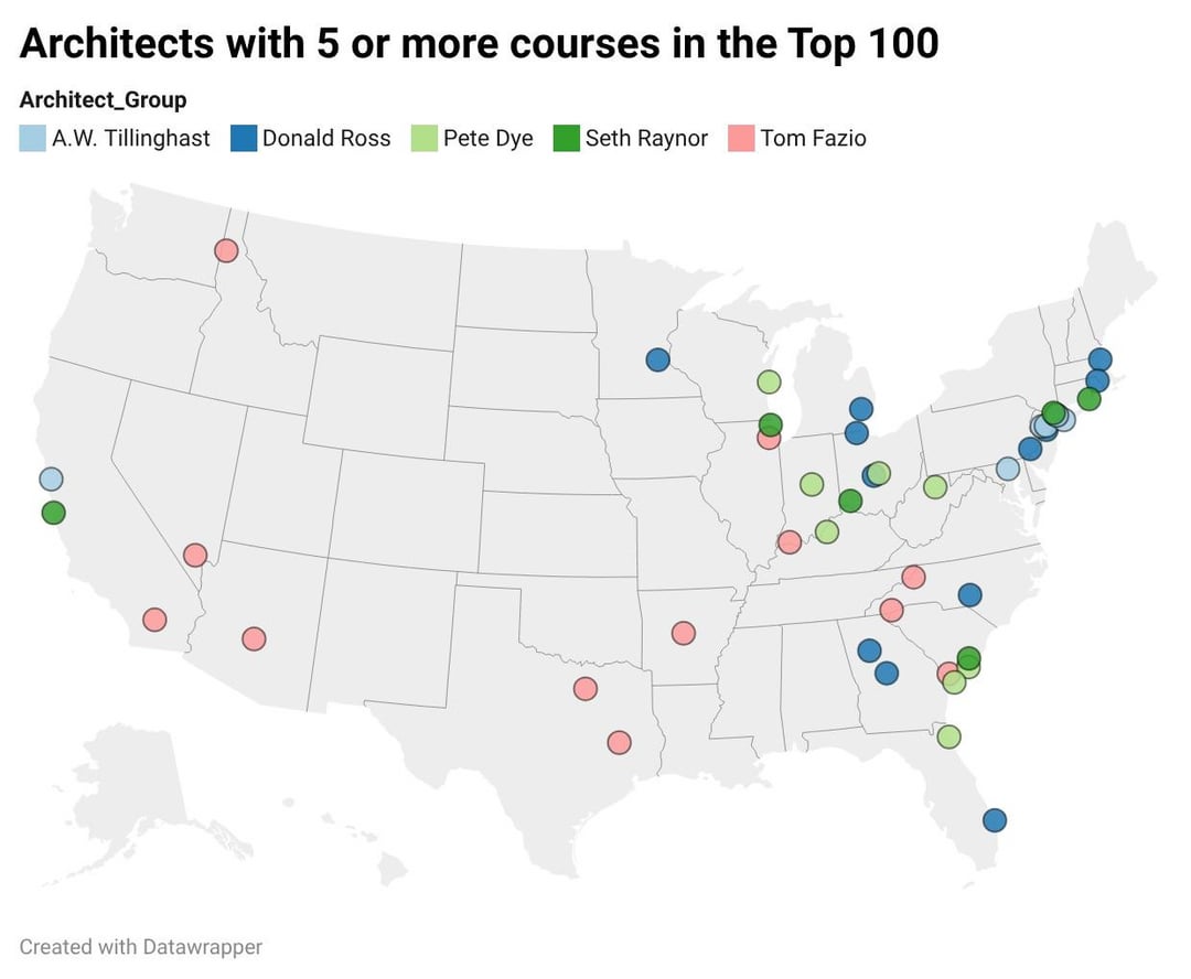 [OC] created an app that visualizes golf data. Tracks architects played, pga tour venues, top 100 courses, cities, states, miles traveled and more. Used golf-course-database.com for the primary course data. Built my own back end databases using Claude.ai for tour venues, exclusivity algorithms, US Open venues and more. Use data wrapper for mapping some visualizations.